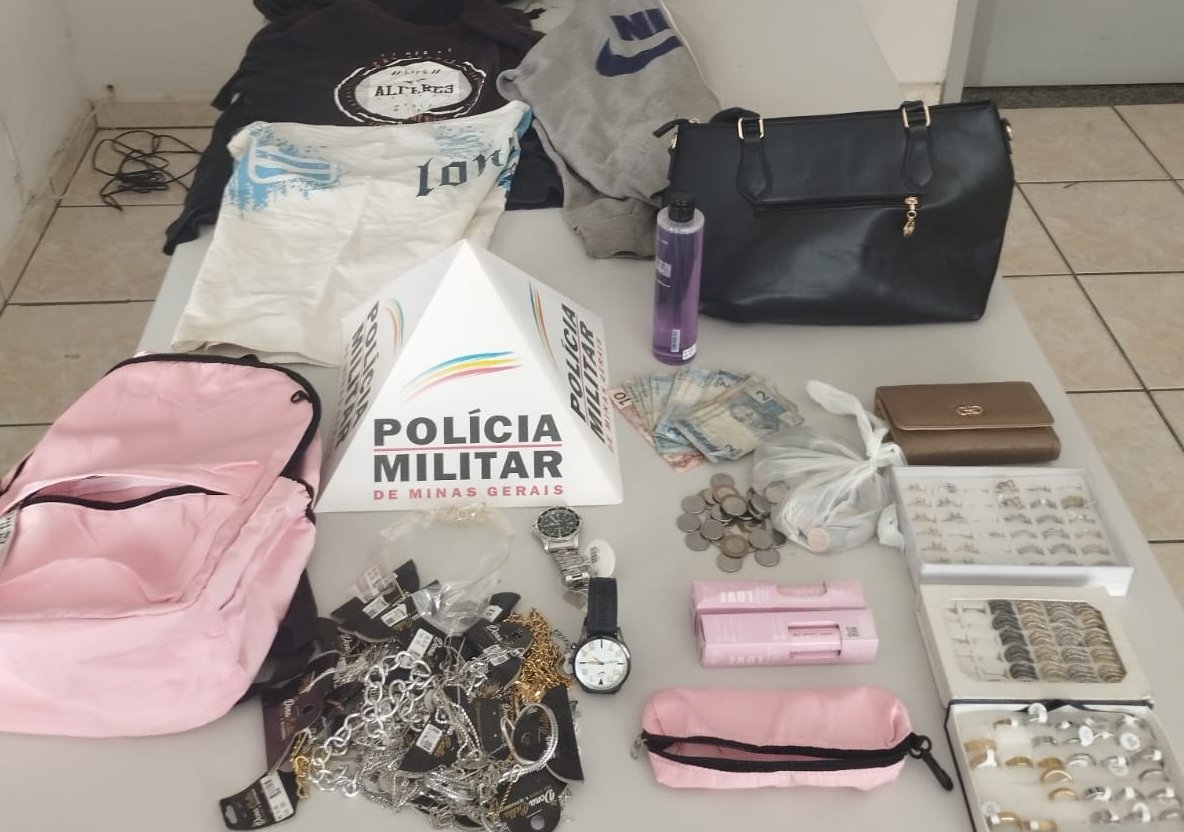 Ao realizar diligências, a PM encontrou o autor no terminal rodoviário, juntamente com sua mãe e irmã aguardando um ônibus para Carangola. Localizaram com ele a mochila rosa contendo algumas das bijuterias e outras em seu pescoço, bem como uma quantia em dinheiro.
