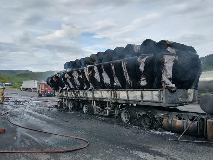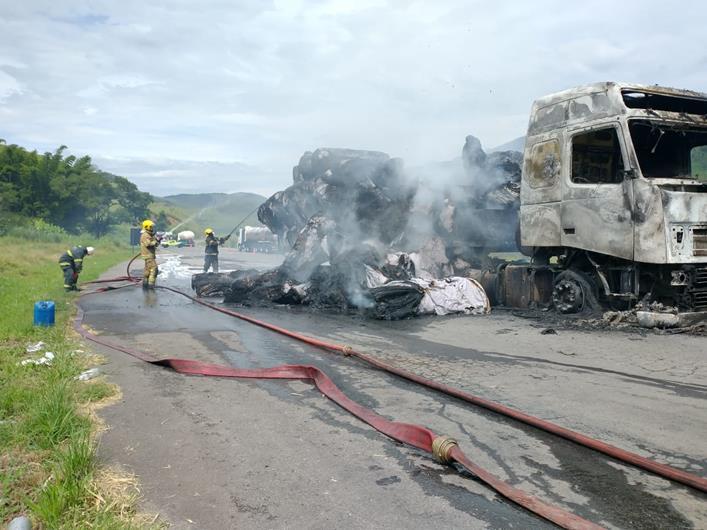 O Corpo de Bombeiros de Muriaé atendeu a ocorrência, informando que o o motorista sentiu cheiro de fumaça enquanto dirigia, parou a carreta e ao descer já deparou com chamas saindo próximo do motor, tentou apagar com extintor e não conseguiu, abandonando o veículo que veio a se incendiar, queimando toda a cabine e passando para carga.