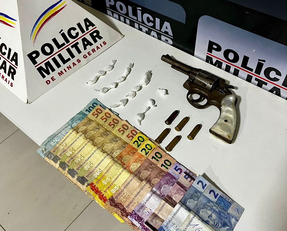 O autor, de 22 anos foi abordado e durante a busca pessoal foi localizado com ele 01 revólver calibre 38 com 05 munições intactas, 14 papelotes de cocaína e R$424,00.