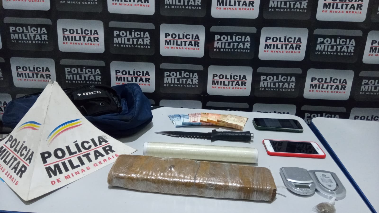 Foi realizada abordagem e durante as buscas foram encontradas 01 barra e 01 bucha de maconha, balança de precisão, R$174,00 e 01 faca.