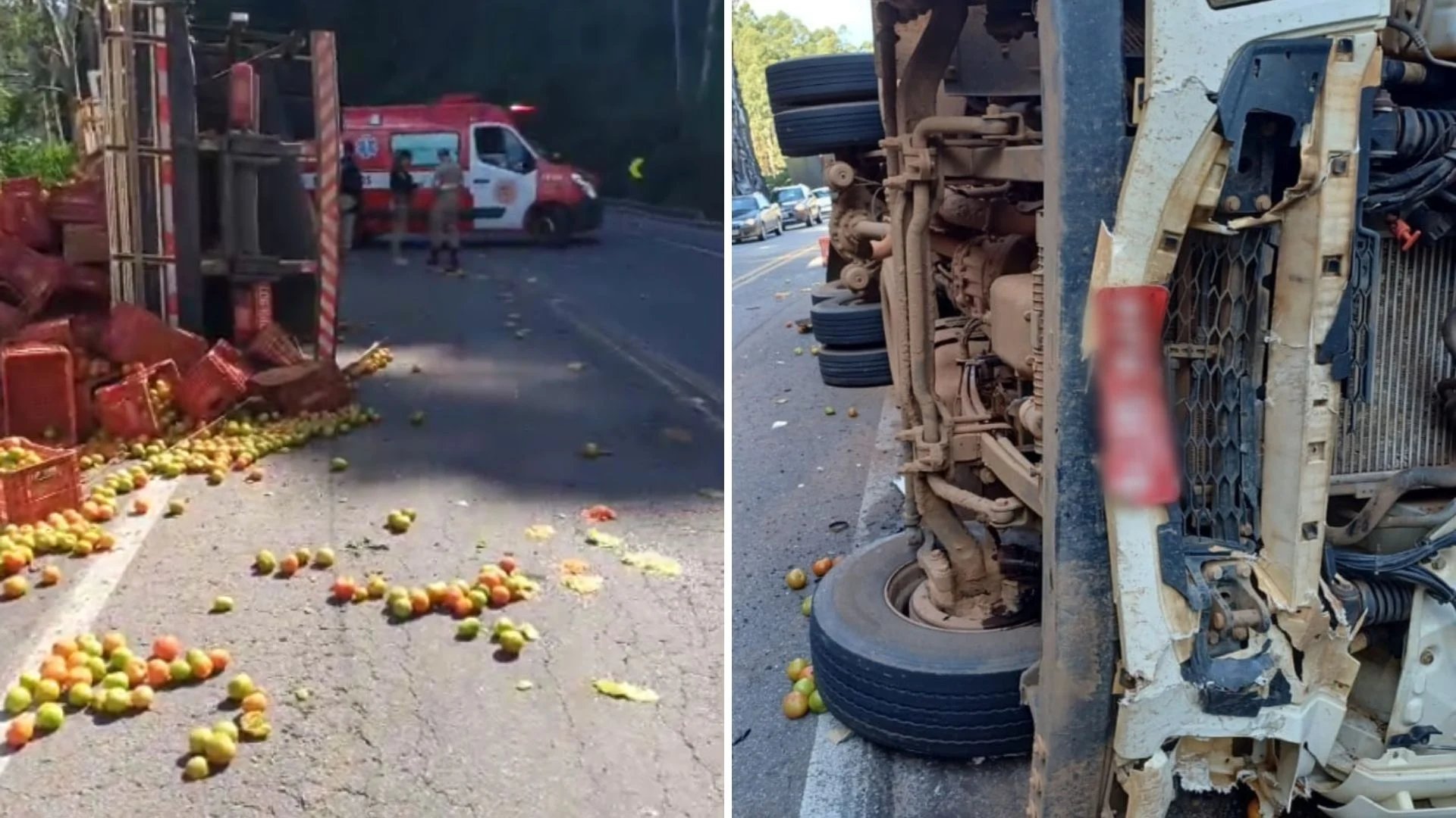 Segundo a Polícia Rodoviária Federal (PRF), o caminhão tombou na curva e colidiu na motocicleta que seguia no sentido contrário. A pista foi parcialmente interditada para as ações de resgate.