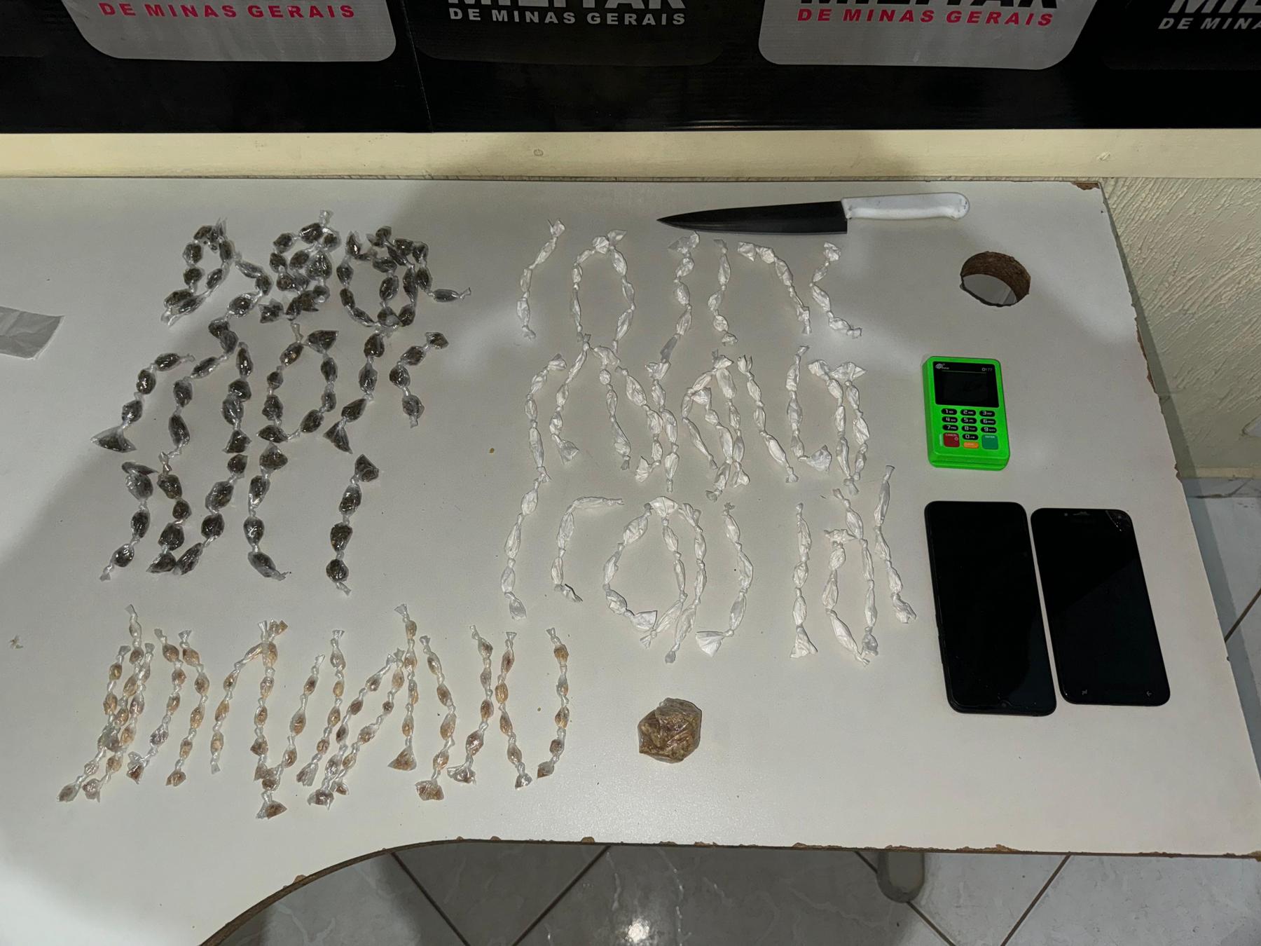 Na primeira residência foi feito contato com os moradores e durante as buscas foram localizadas 88 buchas de maconha, 01 faca, 116 papelotes de cocaína, 64 pedras e 01 porção de crack, sendo presos 02 autores.