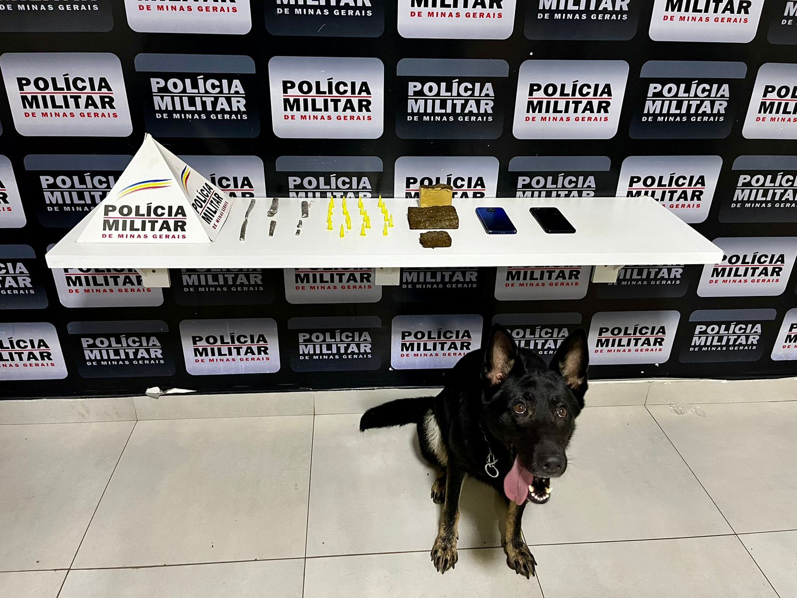 No local as equipes policiais conseguiram localizar o denunciado e durante as buscas com apoio da equipe ROCCA e da cadela de faro Kacau foram localizadas 03 barras, 05 tabletes e 02 buchas de maconha, 19 pinos de cocaína, além de 02 telefones celulares, sendo que um dos telefones ao ser realizada consulta do IMEI junto ao sistema informatizado foi constatado que o aparelho era produto de furto ocorrido na cidade de Manhuaçu em outubro de 2023.