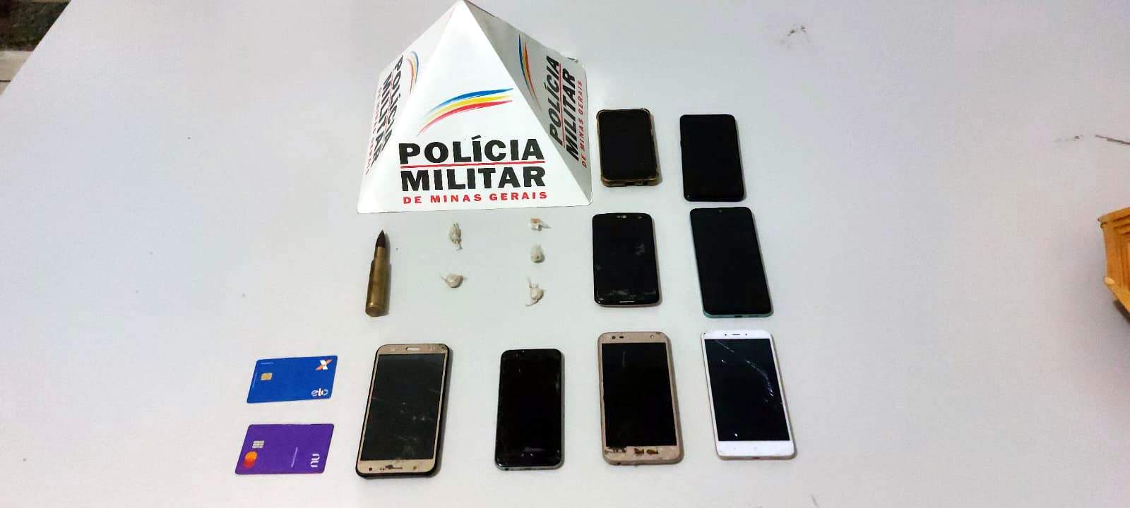 Os militares deslocaram até a casa onde durante as buscas foram encontrados e apreendidos 08 telefones celulares, 02 cartões de crédito, 05 pedras de crack e 01 munição calibre .50 intacta.
