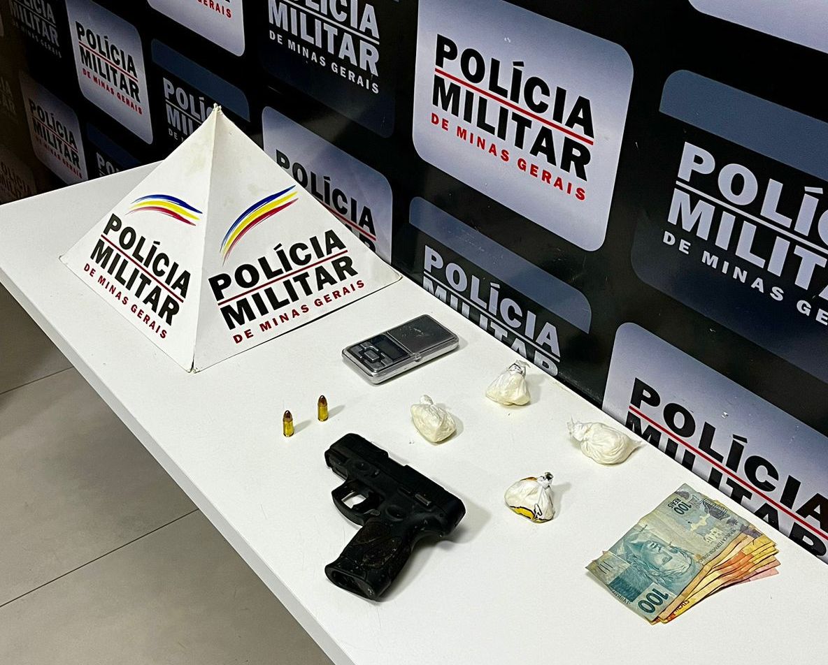 Durante as buscas foram localizadas 01 pistola calibre 9 mm com 02 munições, 04 porções de cocaína, 01 balança de precisão e R$320,00.