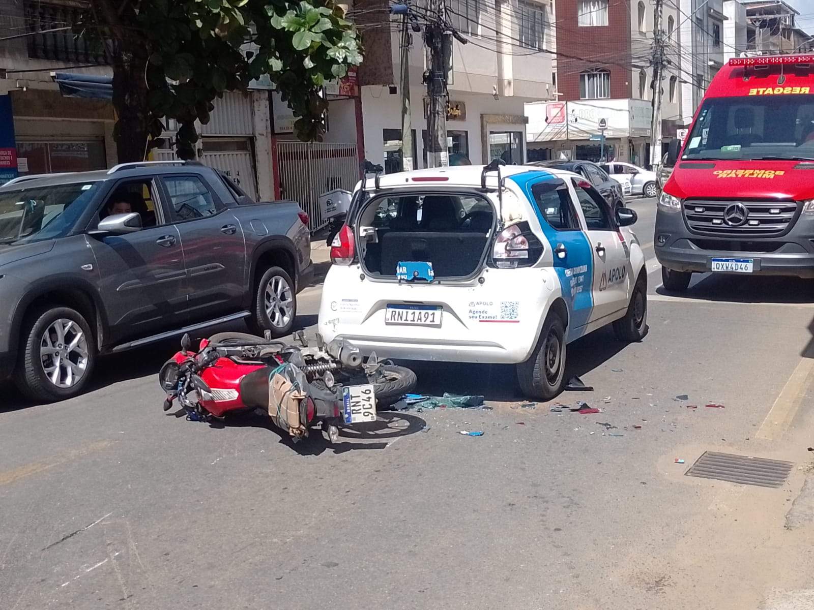 Aparentemente, o Fiat Mobi parou para dar passagem a um pedestre na faixa, quando a moto atingiu a traseira.