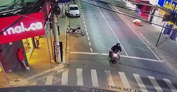 Assim que percebe a ameaça, o motociclista reage rapidamente, acelerando para fugir do assalto. Felizmente, a rápida reação evitou que algo fosse roubado.