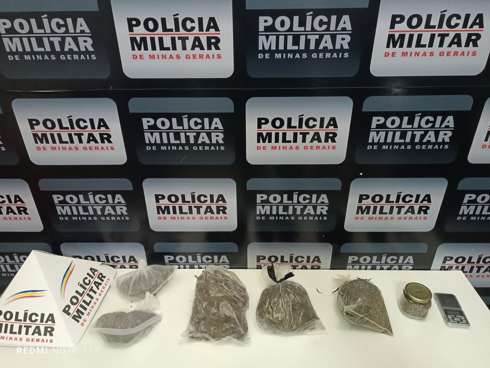 Durante as buscas foram localizadas 05 sacolas e 01 pote com maconha, além de 01 balança de precisão.