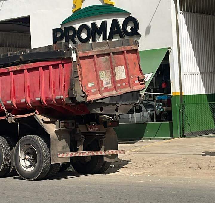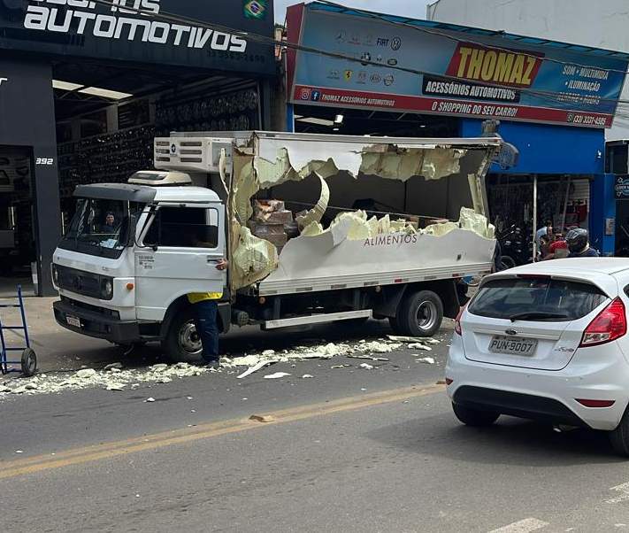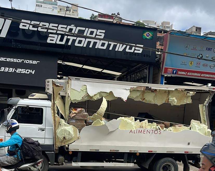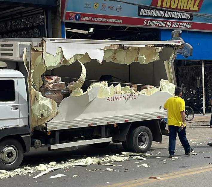 A lateral do caminhão caçamba que estava em movimento ‘raspou’ a lateral do caminhão estacionado, carregado com alimentos frios, destruindo praticamente toda a lateral do baú refrigerado.