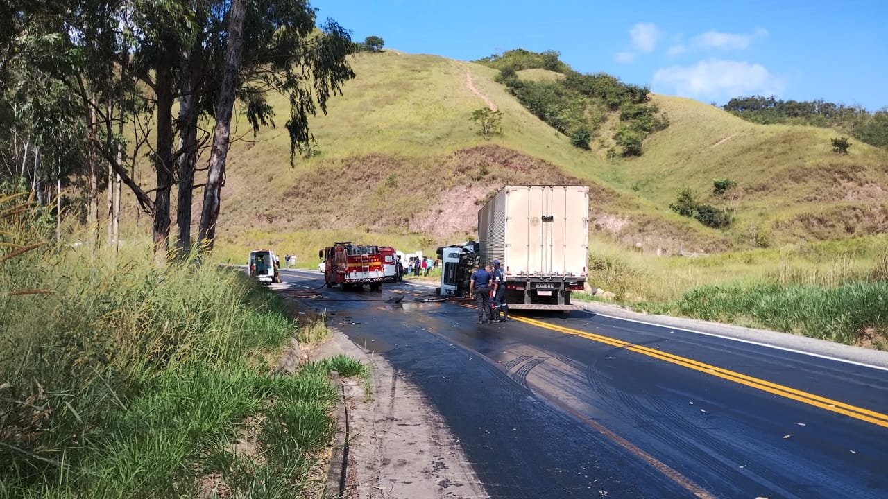 Segundo as informações iniciais, a carreta carregada com moto peças e pneus tombou da curva e continuou chiando na pista até bater de frente com outra carreta, que seguia sentido contrário.