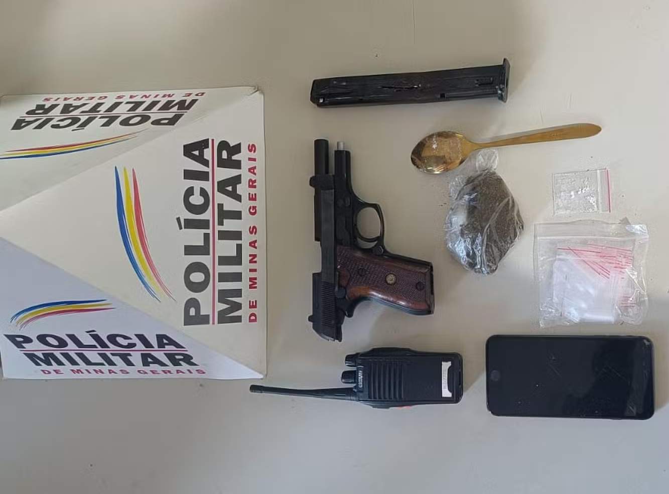 Na casa, os policiais encontraram uma pistola calibre .380, um carregador, várias porções de drogas e diversos itens utilizados para embalar entorpecentes. Também foram apreendidos um rádio comunicador, uma colher com resquícios de cocaína e um celular.
