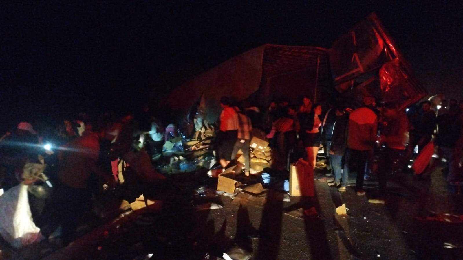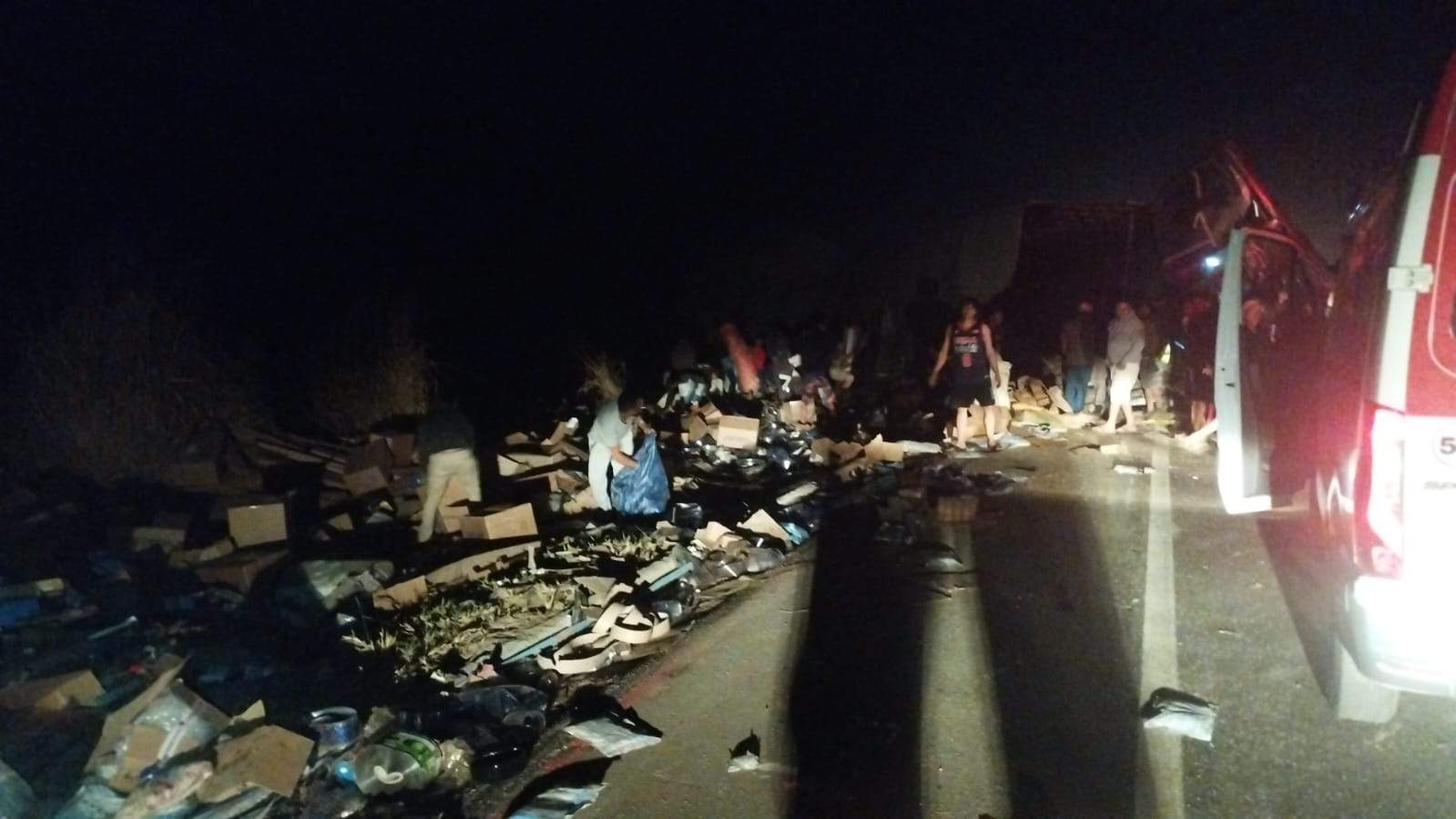 Toda a carga de produtos diversos ficou espalhada na pista. Praticamente todos os produtos foram rapidamente saqueados por centenas de pessoas que se aglomeraram no local do acidente.