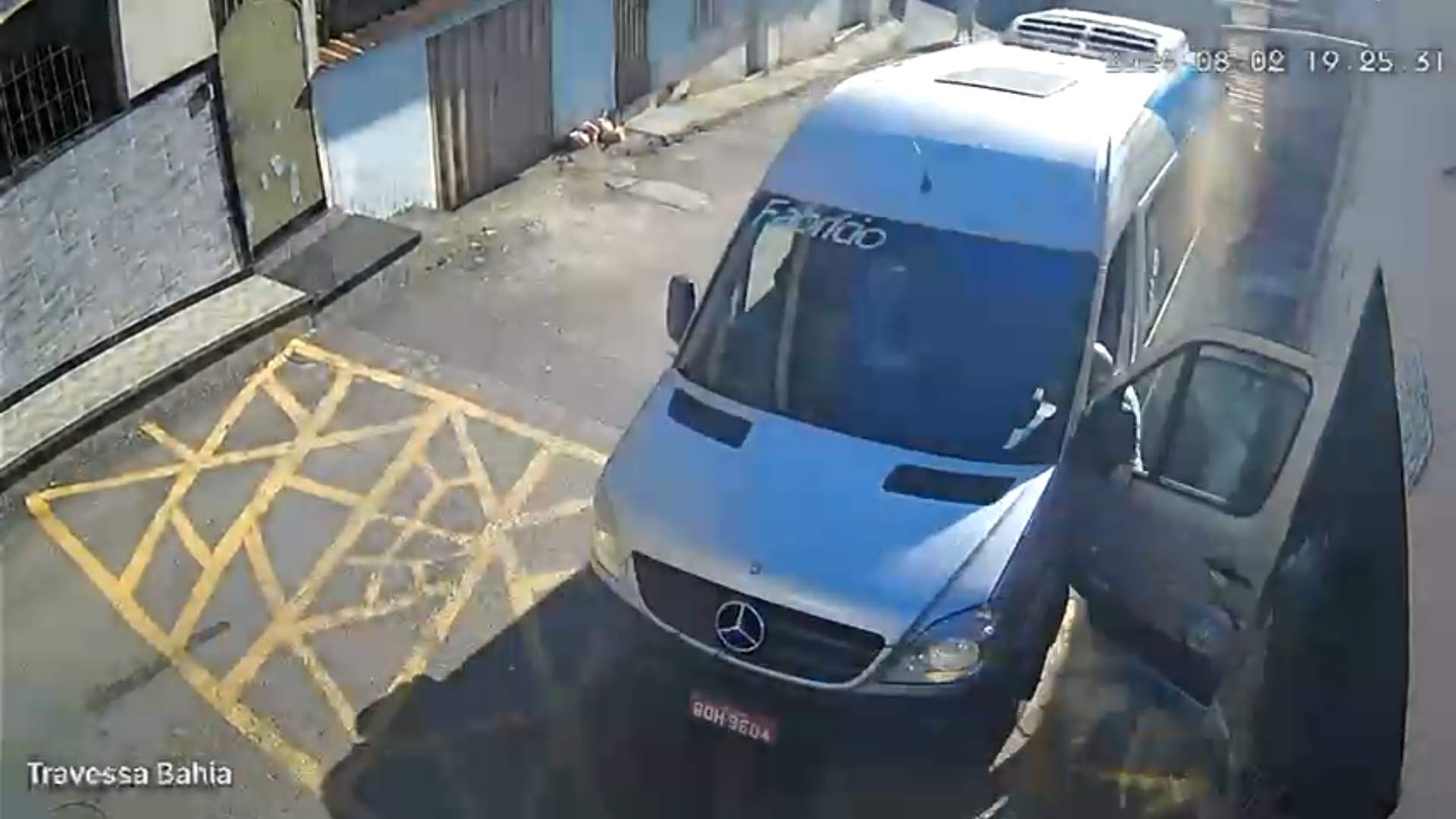 Em seguida é possível ver que de repente o veículo começa a descer a rua. O motorista corre para tentar entrar na van e impedir que o veículo continuasse a descer. O motorista alcança o volante, mas acaba sendo arrastado. A van atingiu o portão de uma casa e uma moto que estava estacionada. O proprietário da moto estava ao lado dela. O pedreiro Custódio de Paula Correia Júnior disse que pensou que fosse morrer, mas conseguiu correr a tempo, antes da van atingir a moto dele.