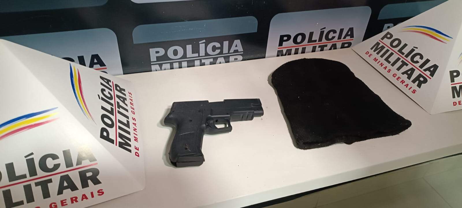 Durante consulta ao sistema informatizado foi constatado que o veículo havia sido furtado no dia 11/07/2024 e ao serem realizadas buscas foram localizados uma réplica de arma de fogo e uma touca preta.