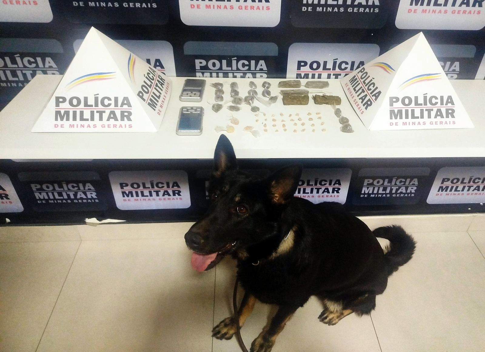 Durante a atividade foi aplicada a cadela de faro Kacau, sendo localizadas 18 buchas e 05 tabletes de maconha, 33 porções de crack e 02 balanças de precisão.