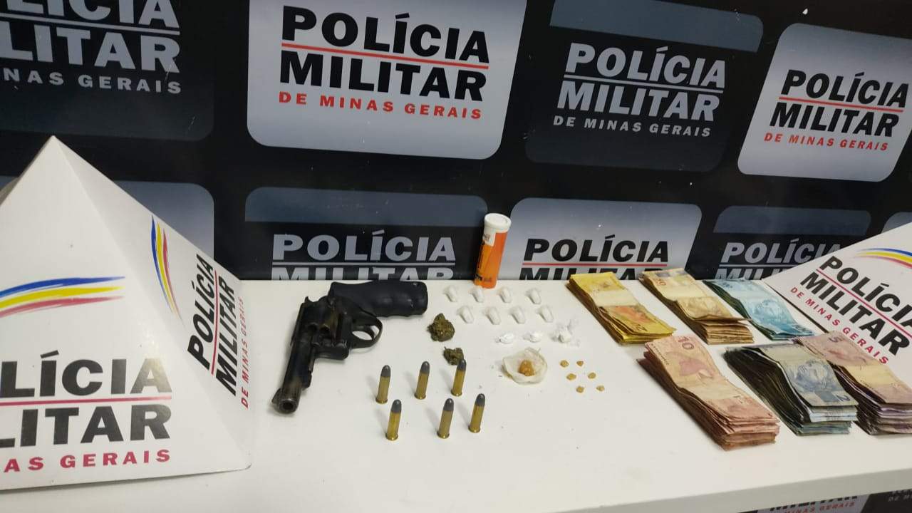 Foi feito contato na residência e durante as buscas foram localizados 01 revólver calibre 38, com 06 munições do mesmo calibre, 07 porções de crack, 11 porções de cocaína, 02 porções de maconha e R$4.305,00 em dinheiro.