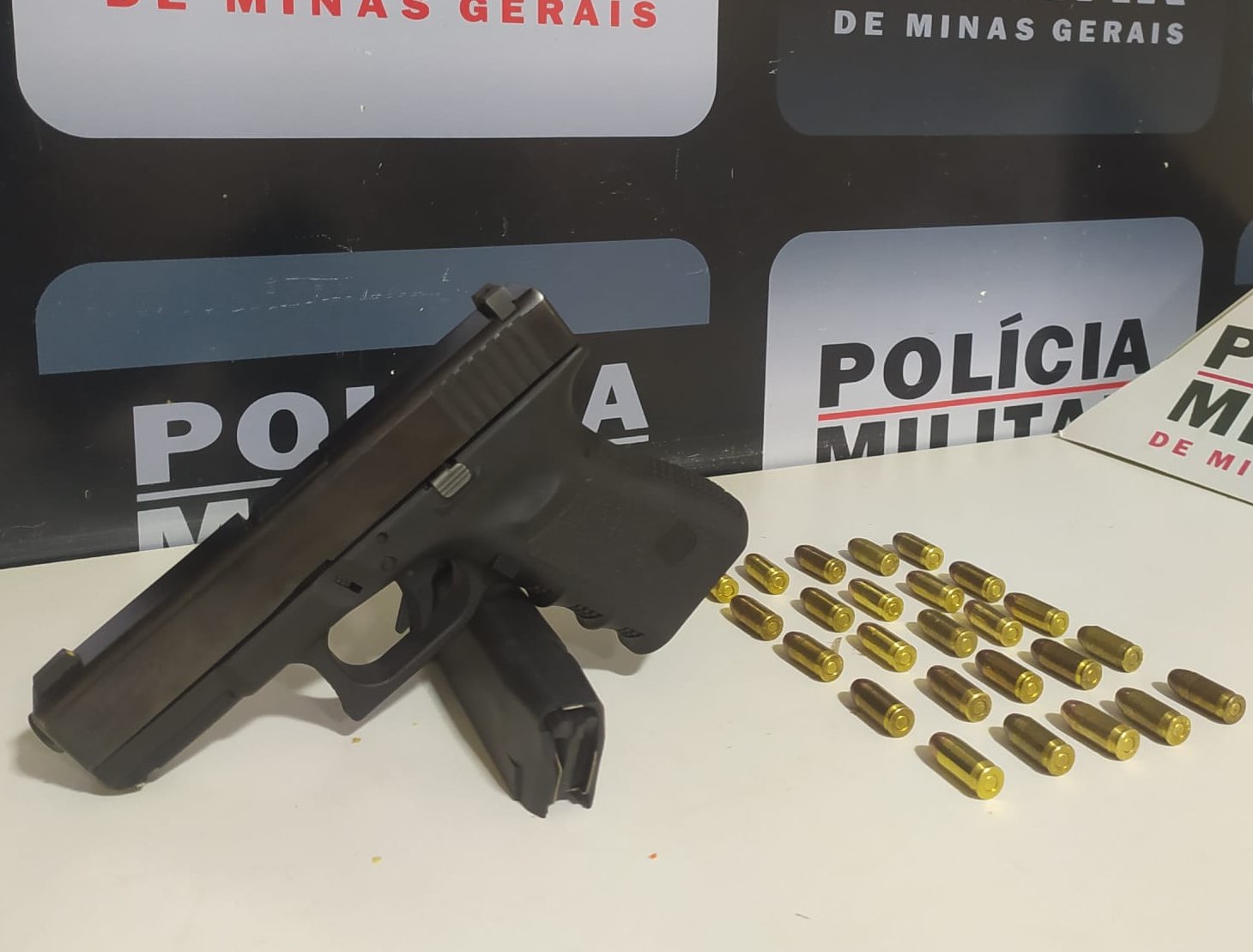 Foi montado um cerco e bloqueio no local, e o veículo foi abordado. Durante a busca no interior da caminhonete, foram localizadas uma pistola calibre .380 com 15 munições e mais 10 munições intactas escondidas em compartimentos do carro. O motorista de 23 anos, único ocupante do veículo, não assumiu a posse da arma, que apresentava sinais de adulteração.