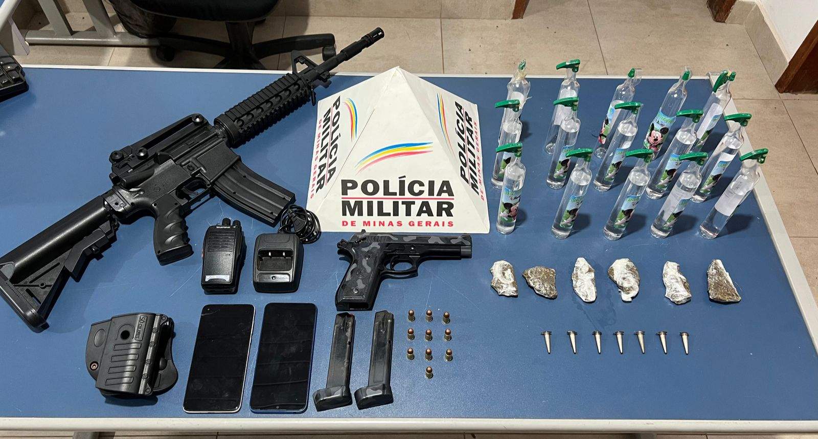 Dentro da residência do suspeito, os policiais também localizaram 6 tabletes de maconha, 7 pinos de cocaína e diversos outros materiais relacionados ao tráfico, incluindo munições e um simulacro de fuzil.