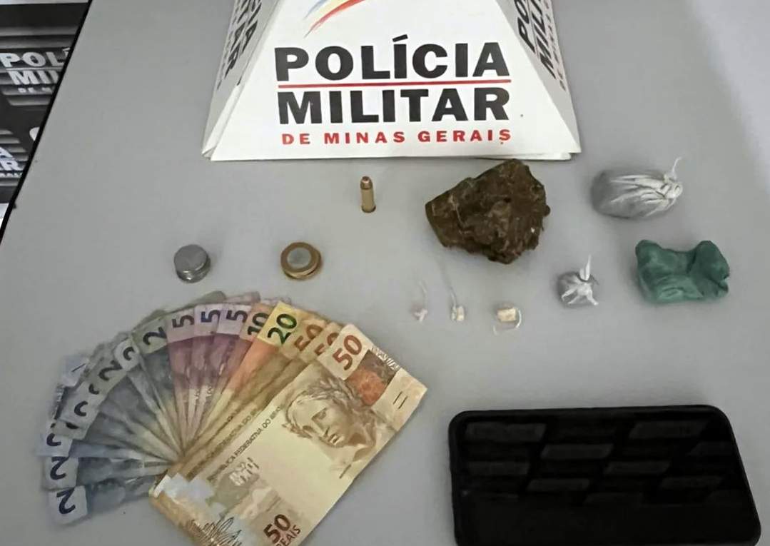 Os militares chegaram ao bairro Vila Vicentina, e encontraram o suspeito contando dinheiro, além disso, ele tinha crack, maconha, um celular, R$ 302,50 e uma munição intacta de calibre.38.