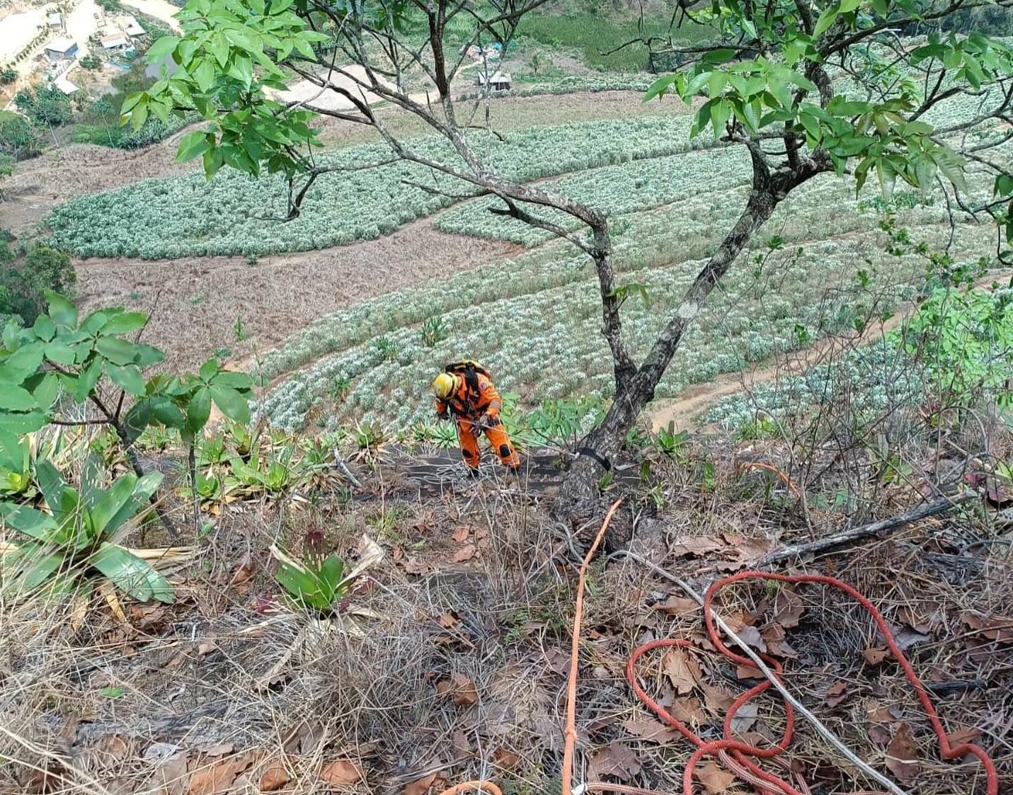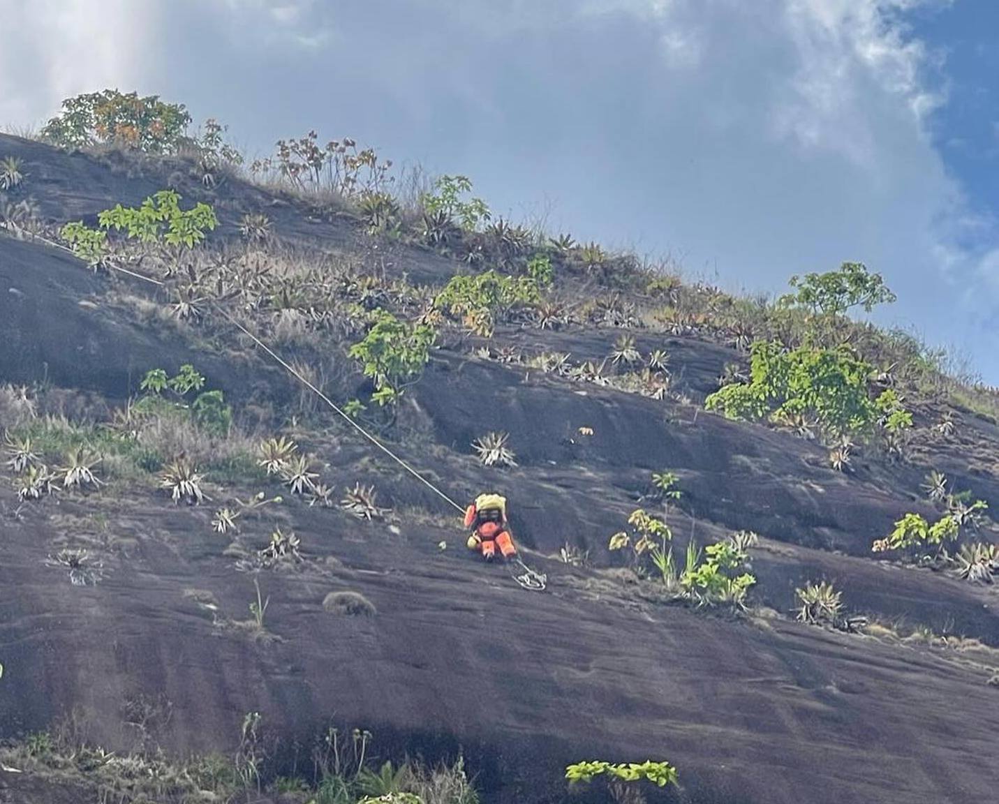 Para acessar a parte superior da rocha, foi necessário também abrir uma trilha na vegetação. O Soldado Lucas Alves realizou o rapel e retirou o cão da pedreira sem ferimentos, e posteriormente o entregou ao seu dono.
