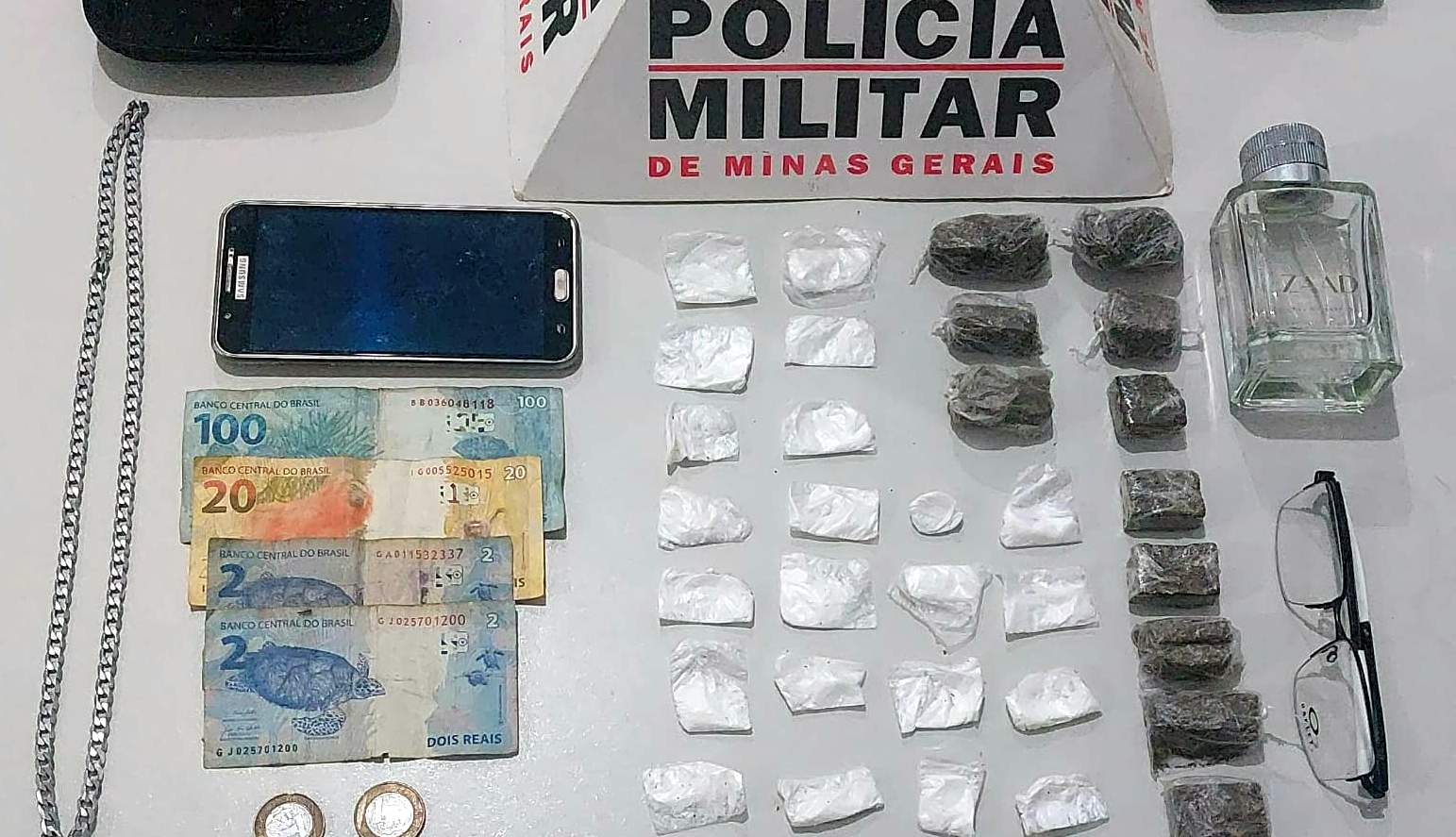 O suspeito, que transitava de motocicleta, chamou atenção dos militares ao parar bruscamente ao avistar a viatura, demonstrando comportamento suspeito. A equipe imediatamente realizou a abordagem, procedendo a revista pessoal. Na busca, foi encontrada uma bolsa com 22 papelotes de cocaína, 9 buchas de maconha, duas porções maiores da mesma droga e R$ 129 em dinheiro. Além disso, o celular e a motocicleta do autor foram apreendidos.