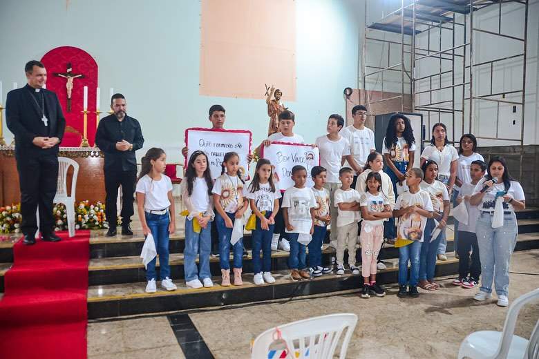 Logo após, as crianças do coral deram início a recepção deram início à recepção com um momento emocionante de boas-vindas acolhendo o bispo no altar.