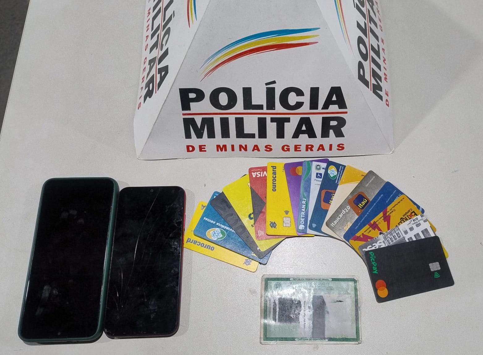 Foram apreendidos diversos cartões bancários, documento falso e celulares.