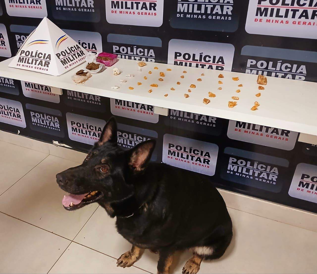 As equipes se deslocaram até a referida rua e o denunciado não foi localizado, porém com o apoio da equipe ROCCA foi aplicada a cadela de faro Kacau no local, sendo localizados 03 tabletes de maconha, 40 porções de crack e 01 porção de cocaína.