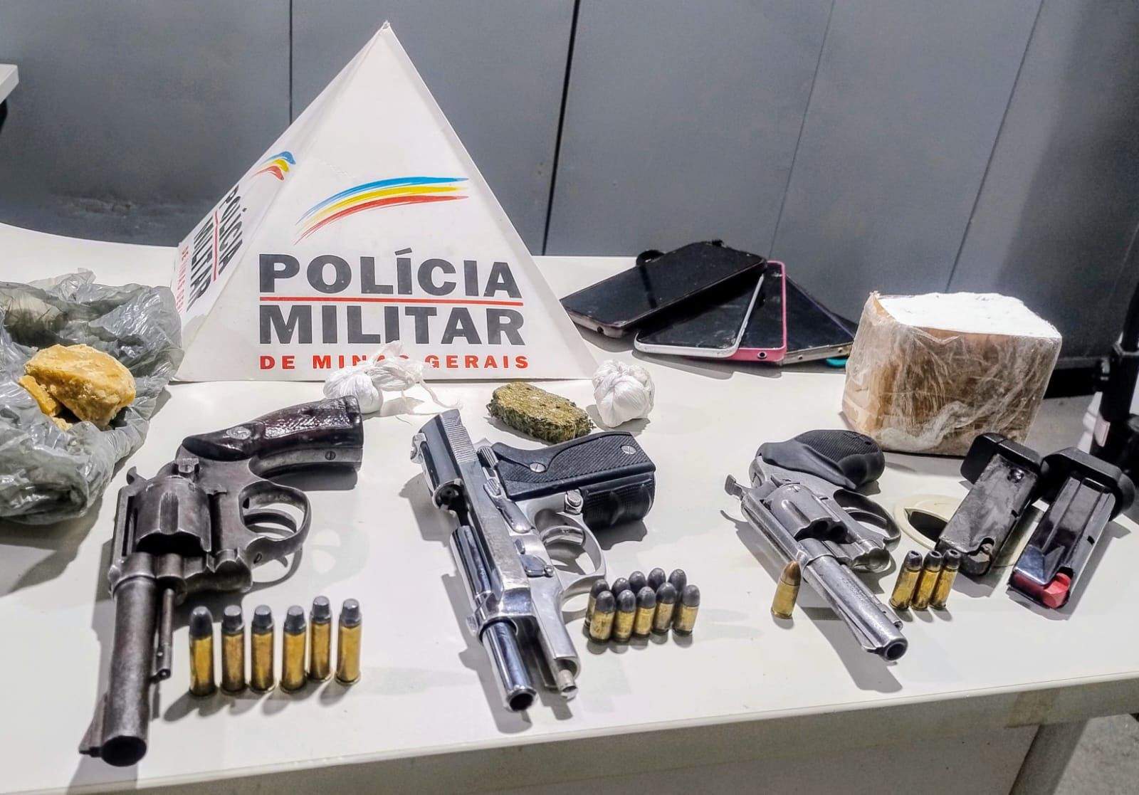 Durante a ação policial militar, as equipes realizaram diligências que culminaram na apreensão de um revólver calibre .38 com numeração raspada, municiado com 6 cartuchos calibre 38 intactos; 01 pistola calibre 380 cromada com 2 carregadores e 10 munições intactas; 01 revolver calibre 32 com 3 munições intactas e 1 munição calibre 6,10; meio quilo de cocaína, uma porção menor da mesma substância, uma porção de maconha e 05 celulares.