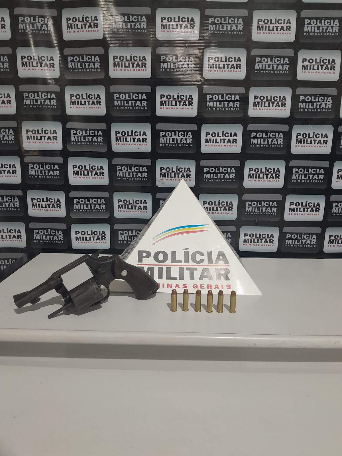 Durante a fiscalização, os policiais encontraram no interior da cabine um revólver calibre .38 da marca Taurus, carregado com seis munições intactas do mesmo calibre.