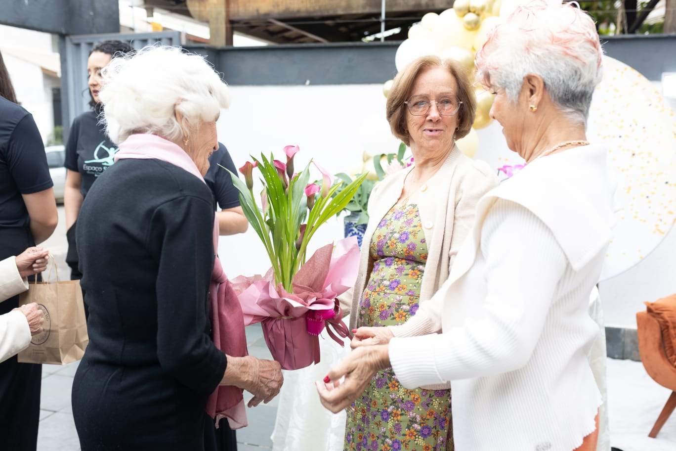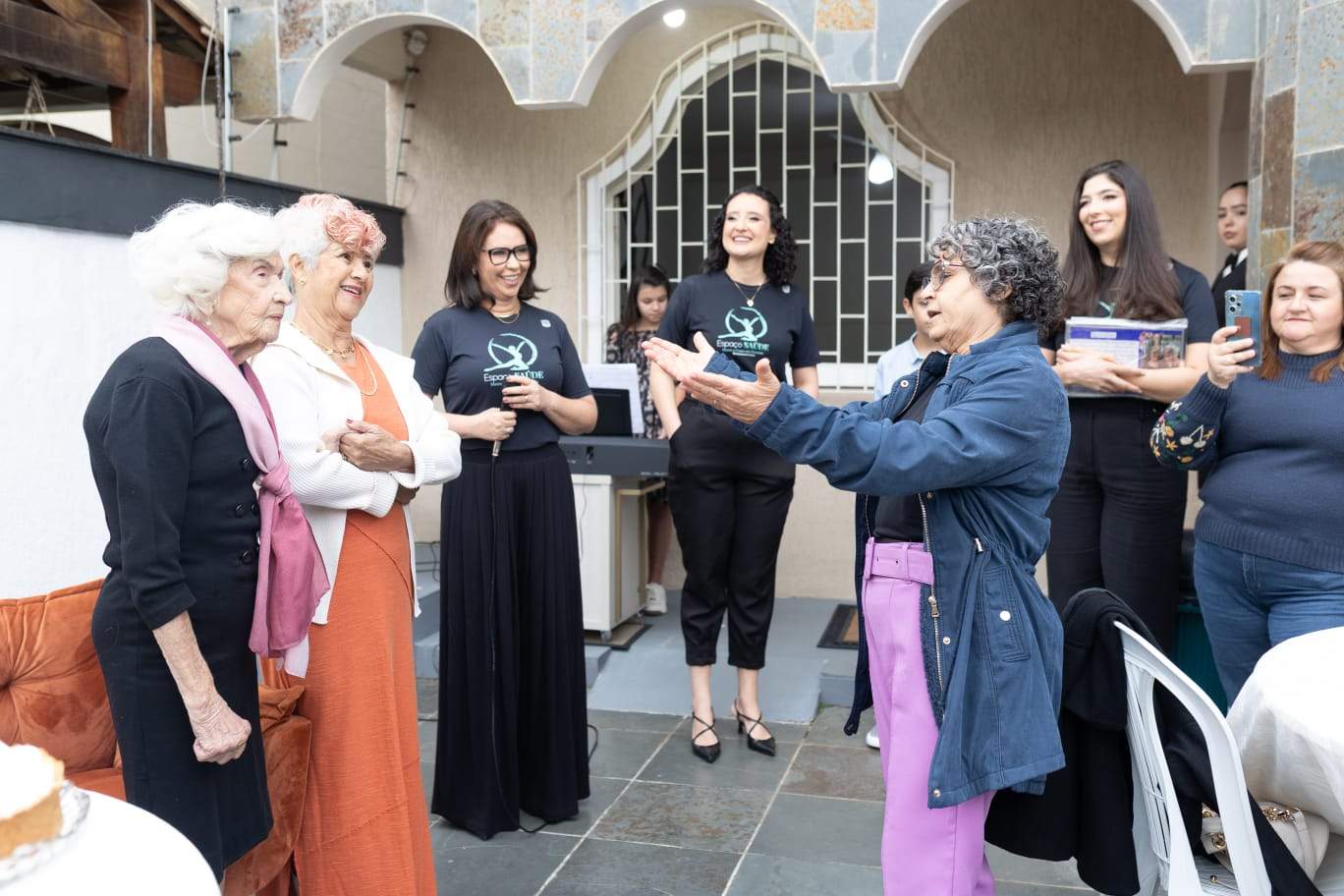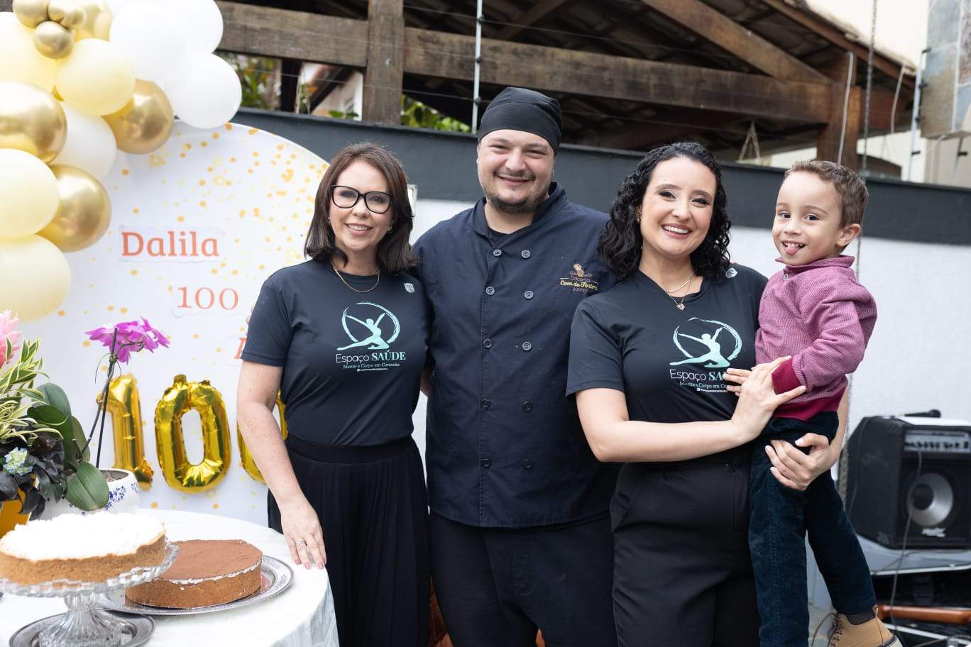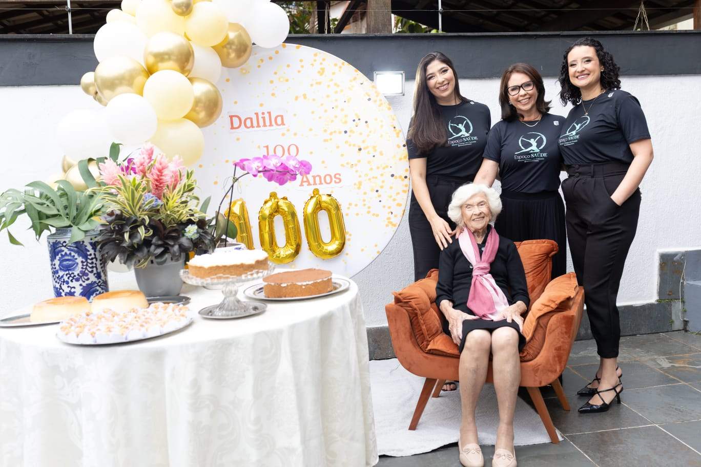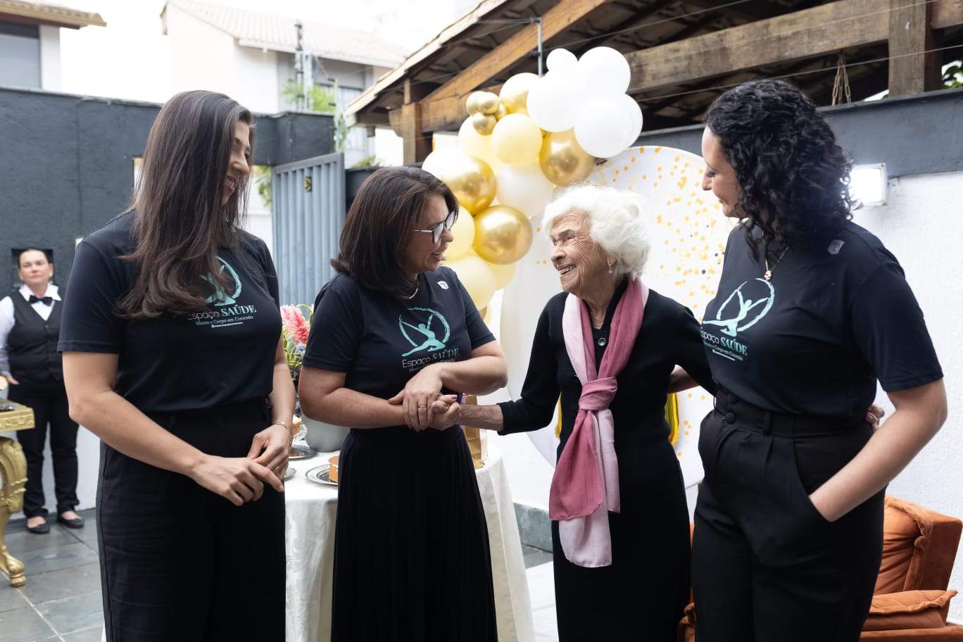 A clínica Espaço Saúde promoveu uma comemoração especial para celebrar os 100 anos de dona Dalila Salazar, aluna dedicada das aulas de Pilates. O evento foi organizado pelas fisioterapeutas Erika Batista, Isabelle Teixeira e Ana Paula, reunindo colegas e profissionais em um clima de alegria e emoção.