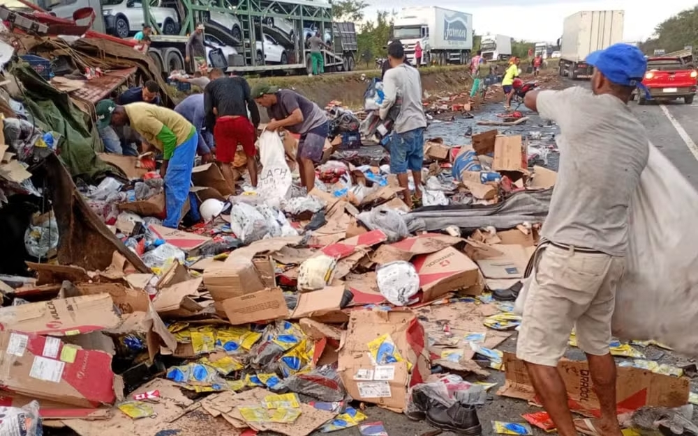 Um grupo de pessoas saqueou parte da carga, que estava espalhada pela pista. O trecho permanece interditado, o que provocou congestionamento na rodovia.
