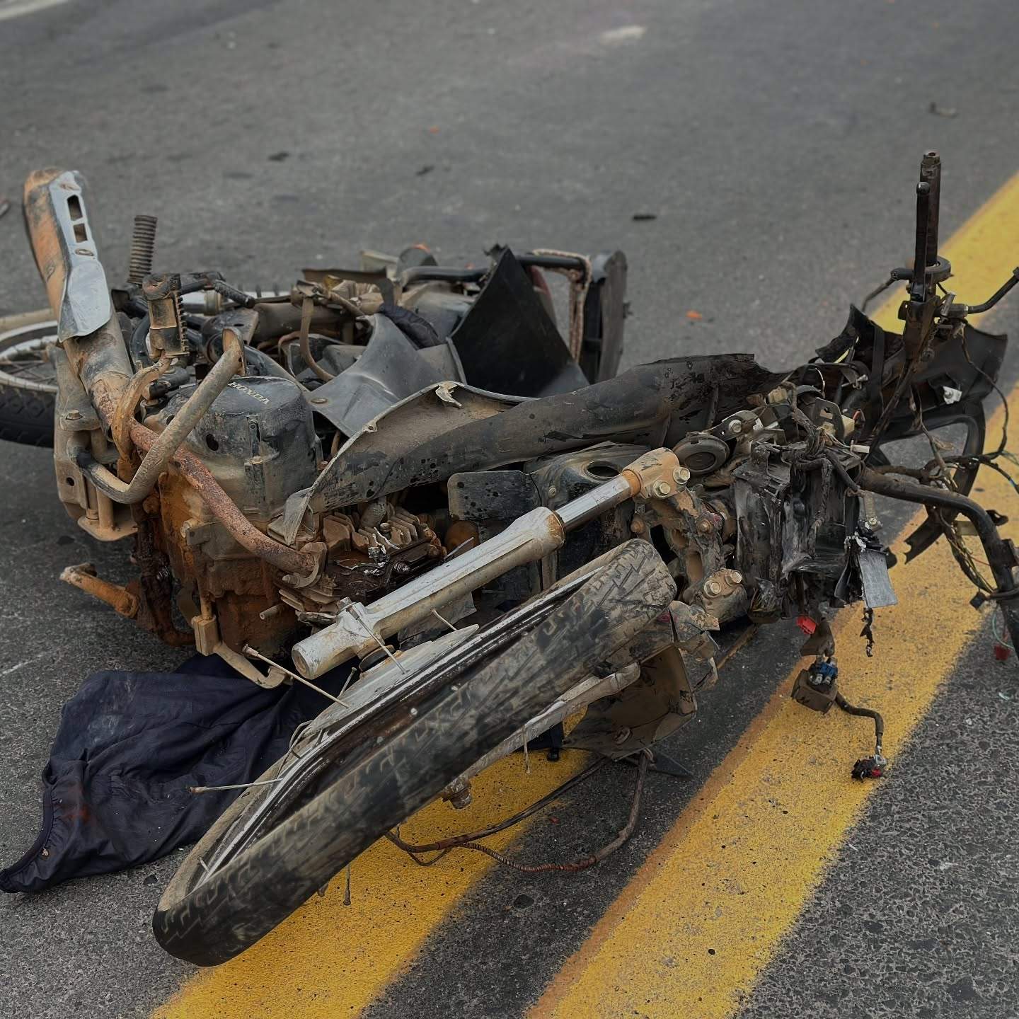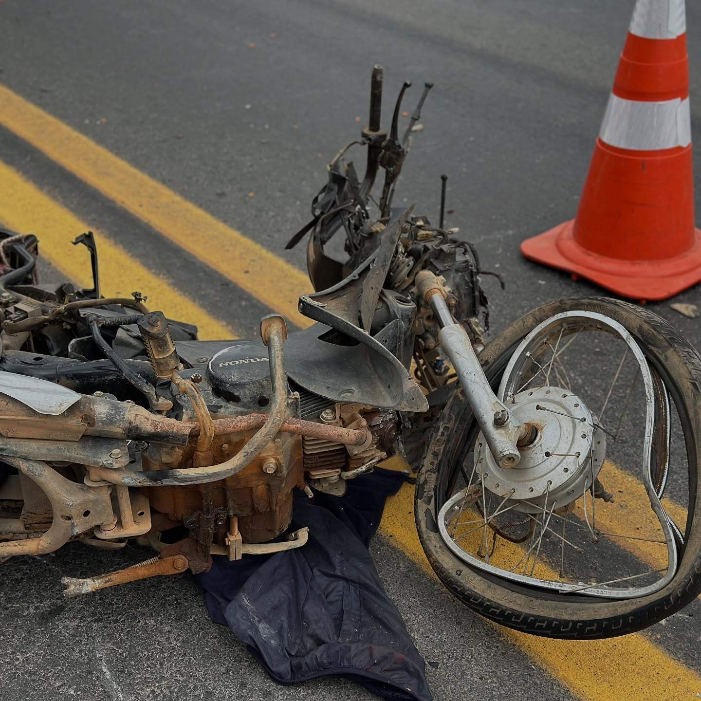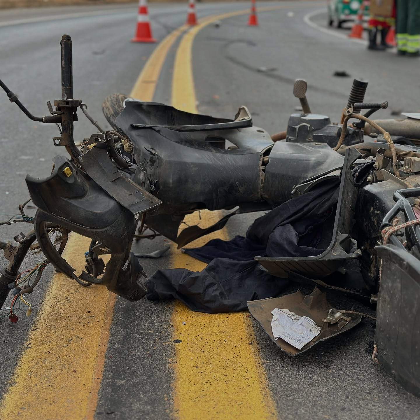 O cenário do acidente evidenciava a gravidade do impacto. A motocicleta ficou completamente destruída, o capacete da vítima foi arremessado a uma distância considerável, e até o banco do veículo se desprendeu, parando às margens da rodovia.