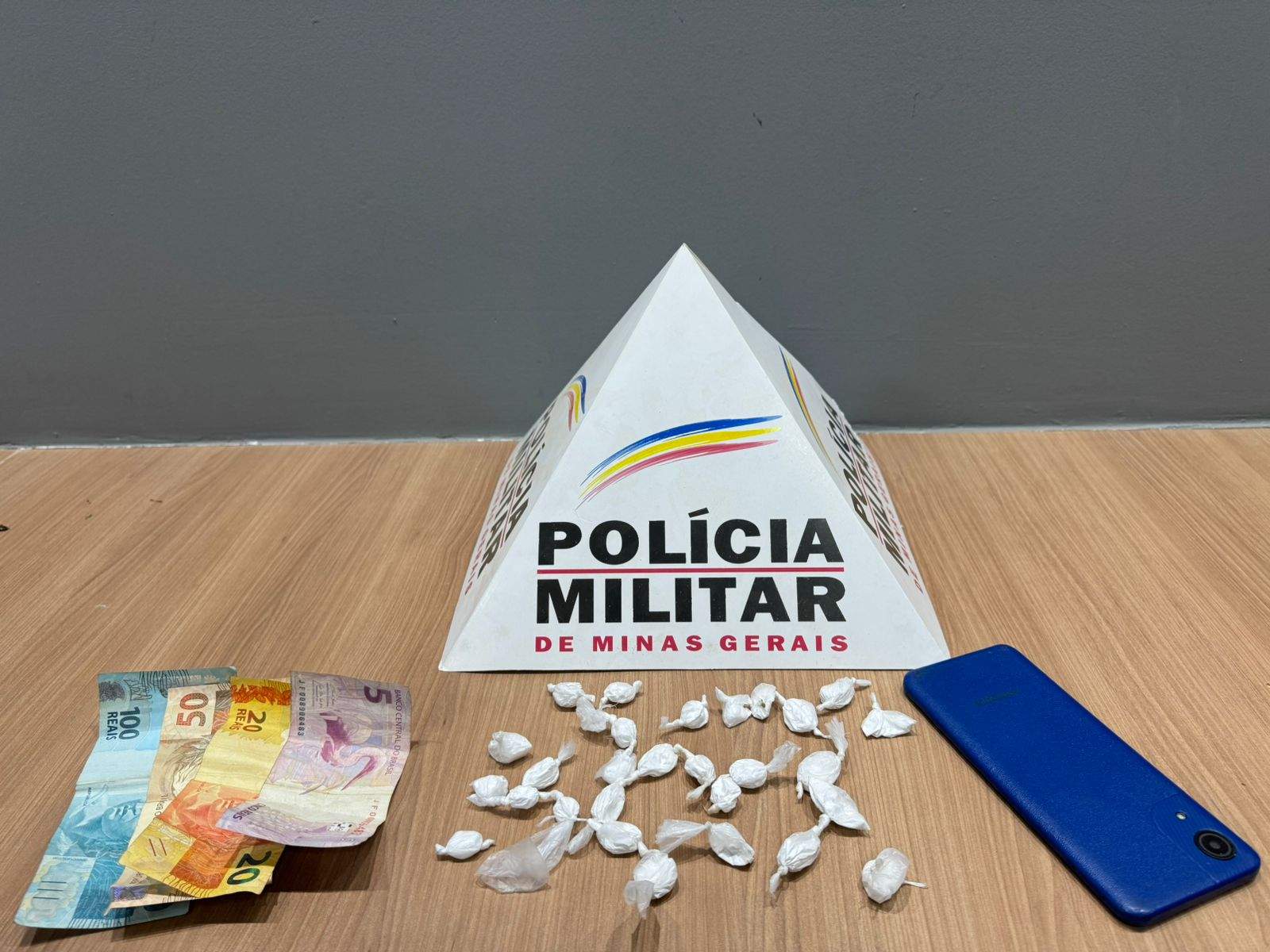 Foram apreendidos 28 papelotes de cocaína, um celular e R$ 175,00 em dinheiro.
