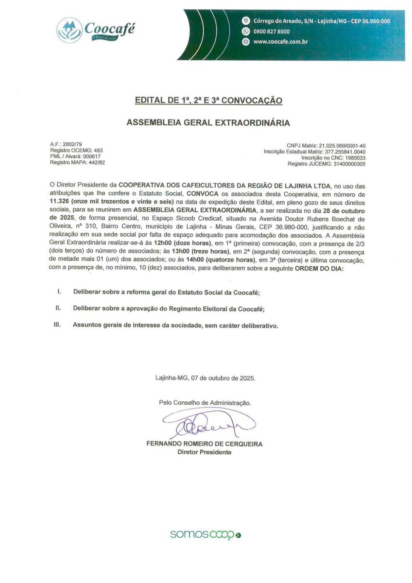 LAJINHA (MG) - A Coocafé anunciou a realização de sua Assembleia Geral Extraordinária (AGE), marcada para o dia 28 de outubro de 2025, em formato presencial, no Espaço Sicoob Credicaf, localizado na Avenida Doutor Rubens Boechat de Oliveira, nº 310, Centro, Lajinha (MG).