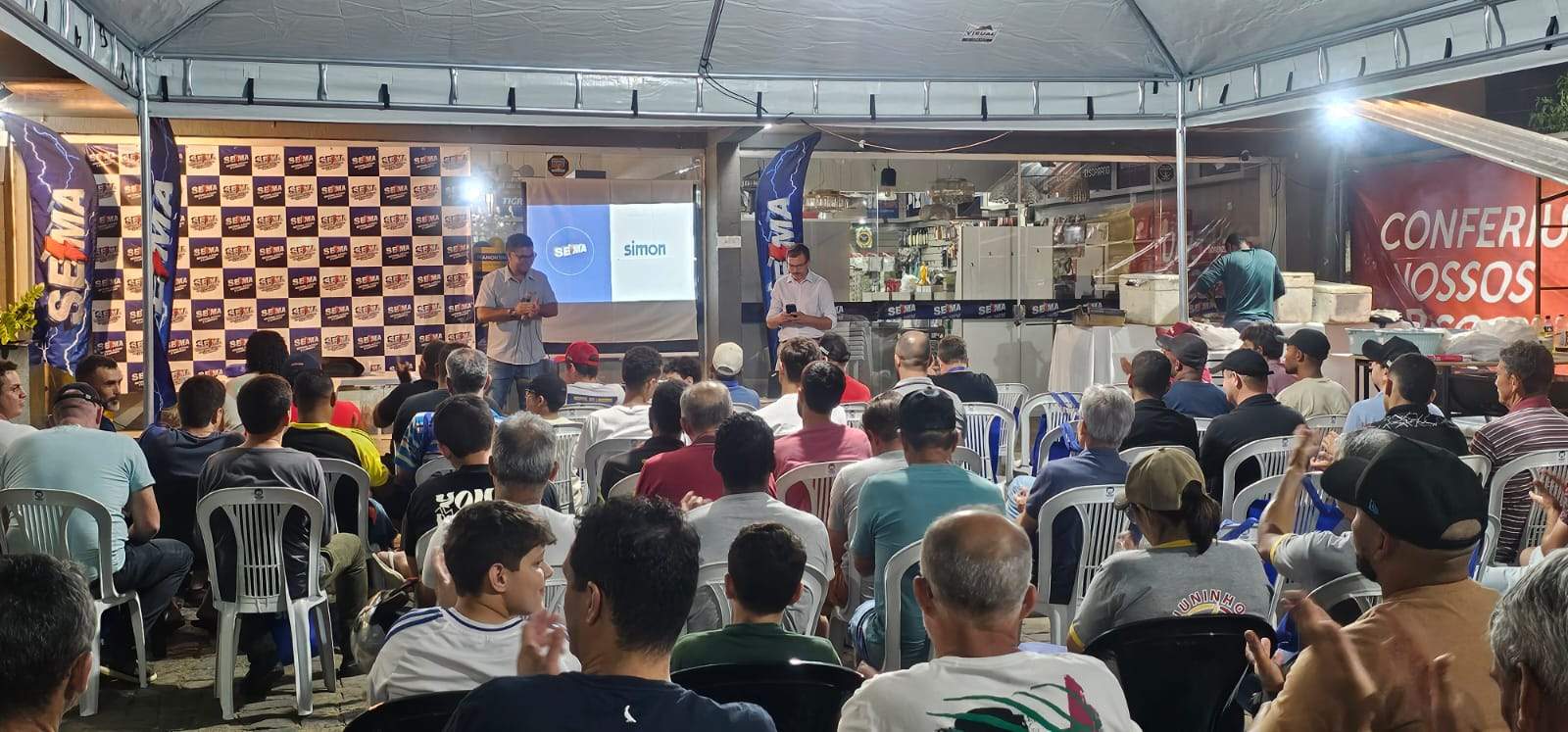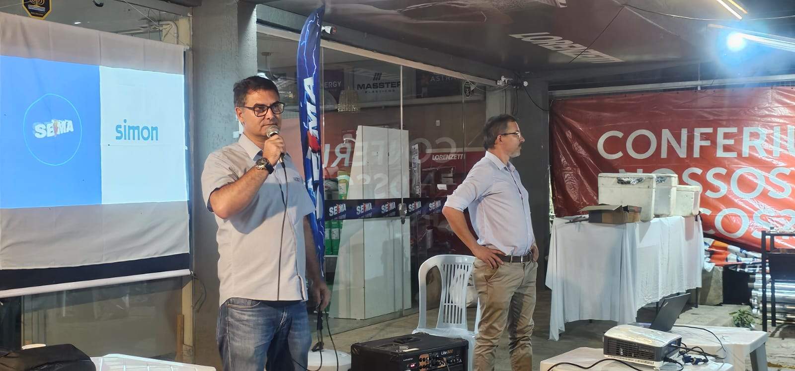 O ponto alto do evento aconteceu na noite da quinta-feira, dia 16, com uma palestra simultânea em todas as lojas da Sema, abordando a nova linha de produtos da Simon, suas aplicações e manutenções.