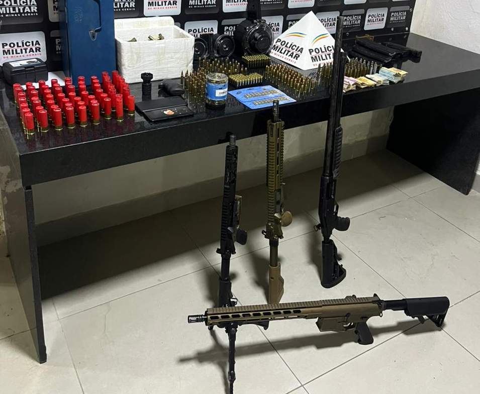 Segundo a PM, entre o material apreendido estavam um fuzil calibre 7.62, duas carabinas calibre 5.56 e uma espingarda calibre 12, além de 937 munições de diversos calibres, incluindo 5.56 e 7.62, usados em combates e contextos militares. Também foram recolhidos carregadores caracol, carregadores alongados e R$ 12 mil em espécie.