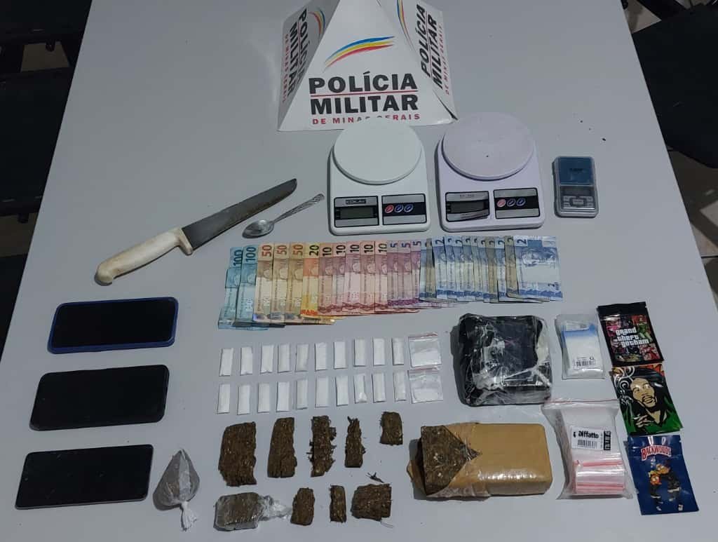 No local, foram apreendidos uma barra e nove tabletes de maconha prensada, uma bucha de maconha, uma barra e 22 papelotes de cocaína, três balanças de precisão, três celulares (Samsung, Motorola e Infinix), uma faca e uma colher com resquícios de drogas, além de diversas embalagens tipo “zip log” com adesivos usados para o armazenamento dos entorpecentes e a quantia de R$ 459 em dinheiro.