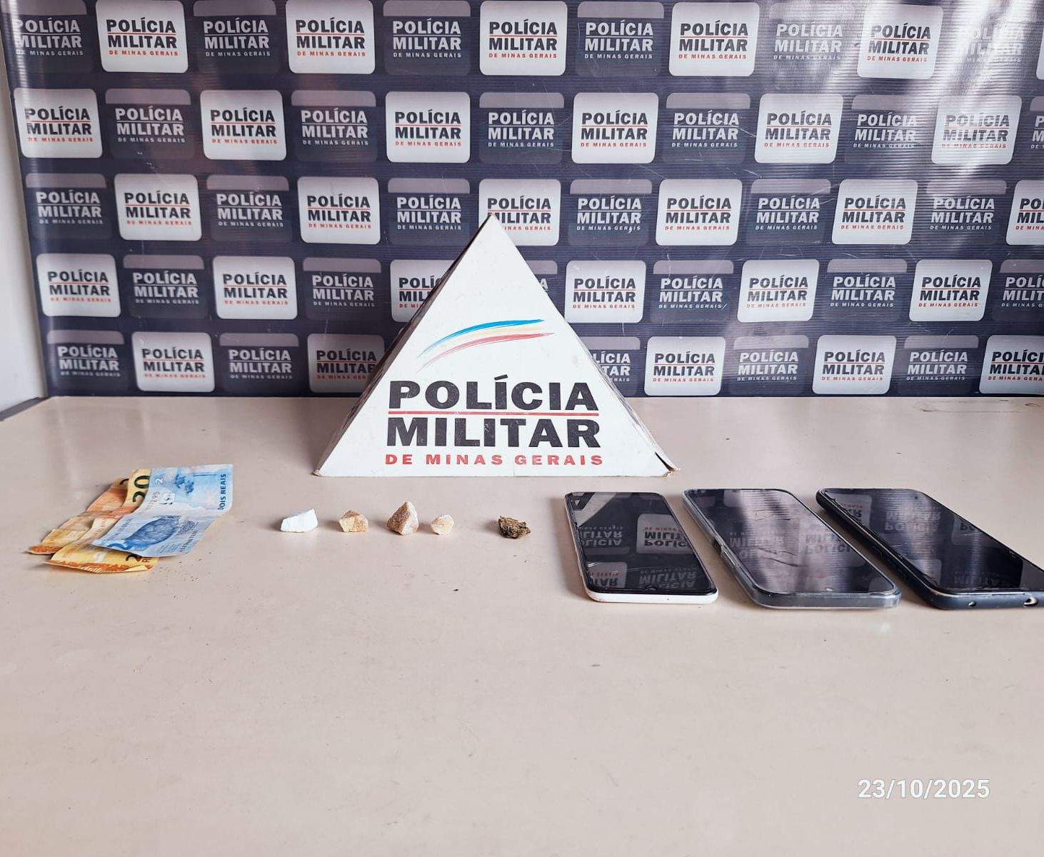 Em buscas feitas em uma lavoura de café próxima ao local da abordagem, os militares localizaram três porções de crack, uma de maconha, uma de cocaína, R$ 42 em dinheiro e três celulares.