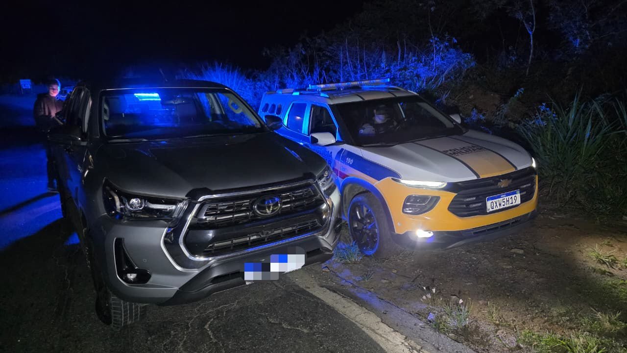 Na vistoria, foi constatado que o veículo usava placas clonadas e possuía registro de furto em 22 de outubro de 2025. Celulares também foram apreendidos no interior da caminhonete.