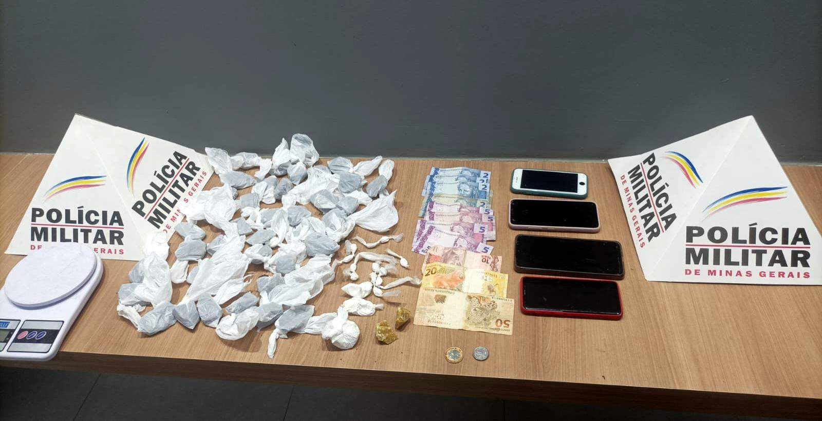 Durante as buscas, foram localizadas 38 buchas e 12 papelotes de maconha, 03 porções de cocaína, 02 pedras brutas de crack, uma balança de precisão e R$111,50 em dinheiro.
