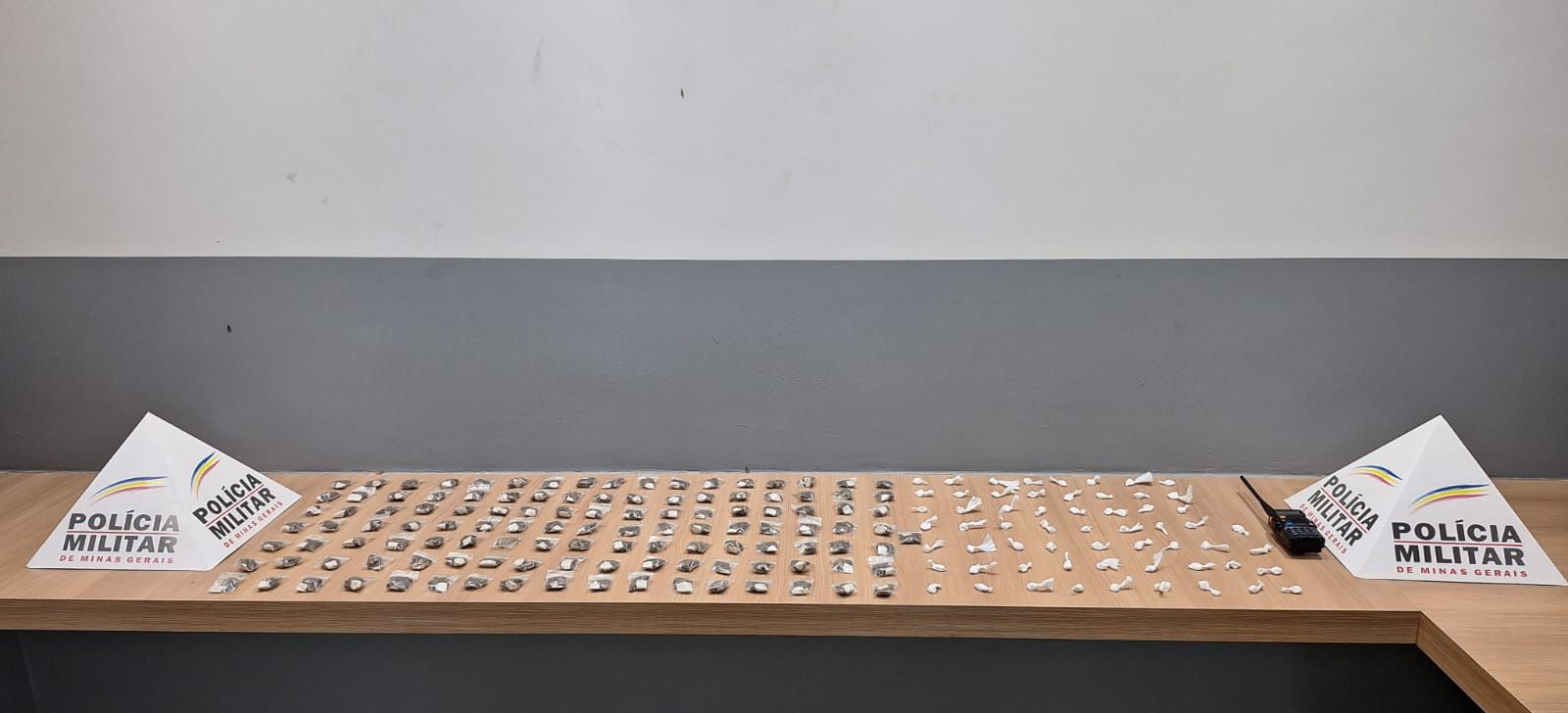 Com eles, foram apreendidas 120 buchas de maconha, 60 papelotes de cocaína e um rádio transmissor, utilizado para comunicação durante o comércio ilícito. Os adolescentes, ambos com idades entre 15 e 16 anos, foram conduzidos à Delegacia de Polícia Civil, acompanhados de seus responsáveis legais, juntamente com o material apreendido.