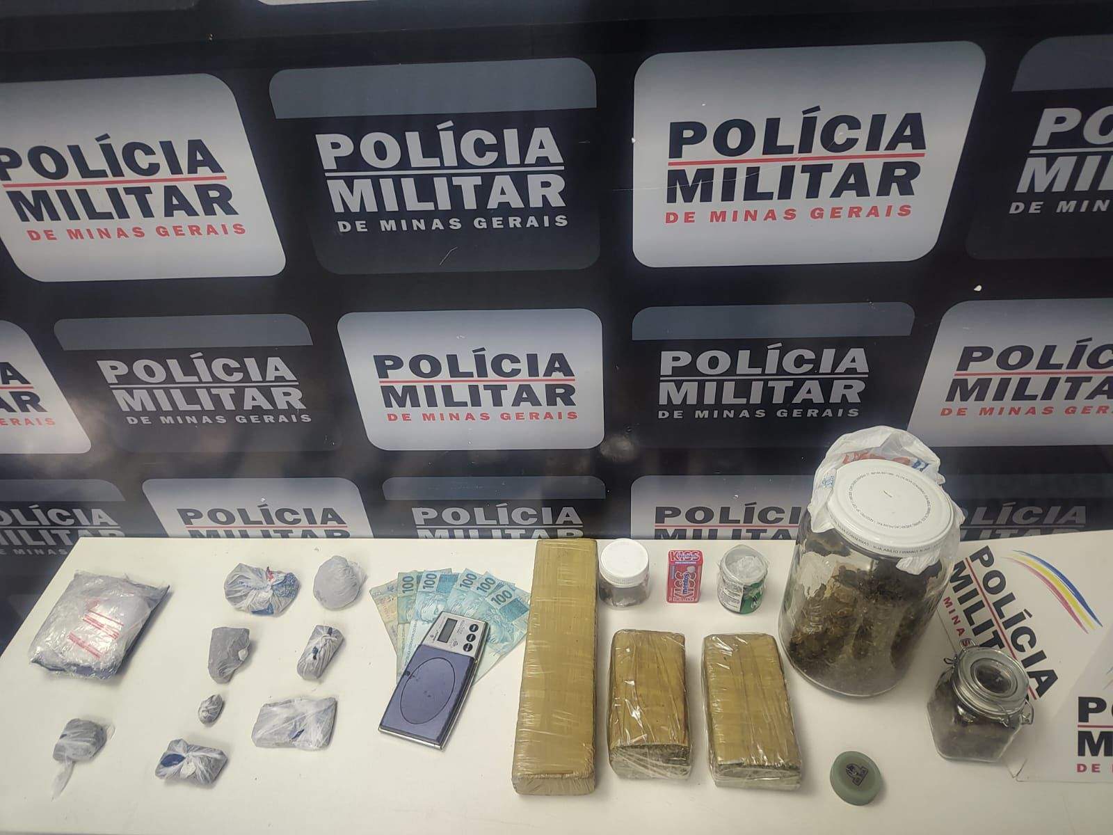 No local, foram apreendidos 03 barras e 10 porções de maconha, 01 balança digital, material para embalar entorpecentes, 03 recipientes com maconha, 01 recipiente com cocaína e R$502,00 em dinheiro. O material foi encontrado no quarto do autor.
