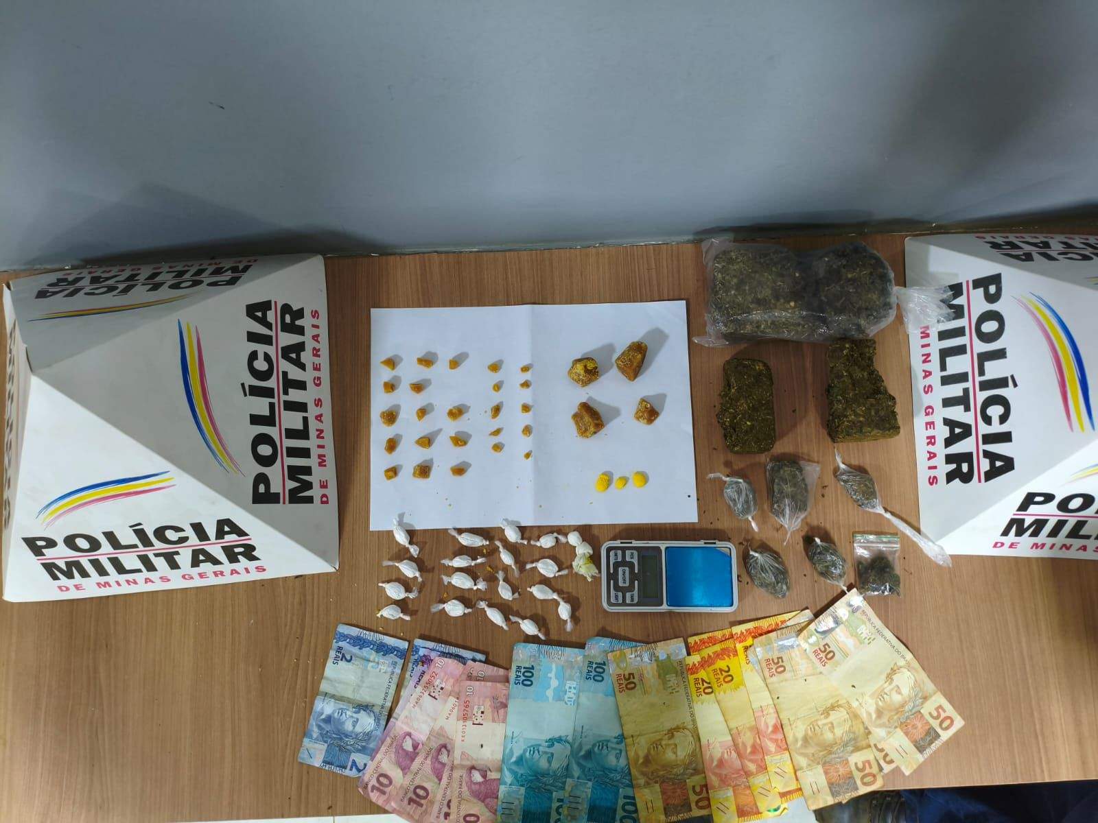 Foram apreendidas três barras e seis buchas de maconha, 28 pedras de crack, 18 papelotes de cocaína, três pedaços de comprimido de êxtase, além de R$ 591 em dinheiro, um carregador de rádio comunicador, uma balança digital e uma faca.