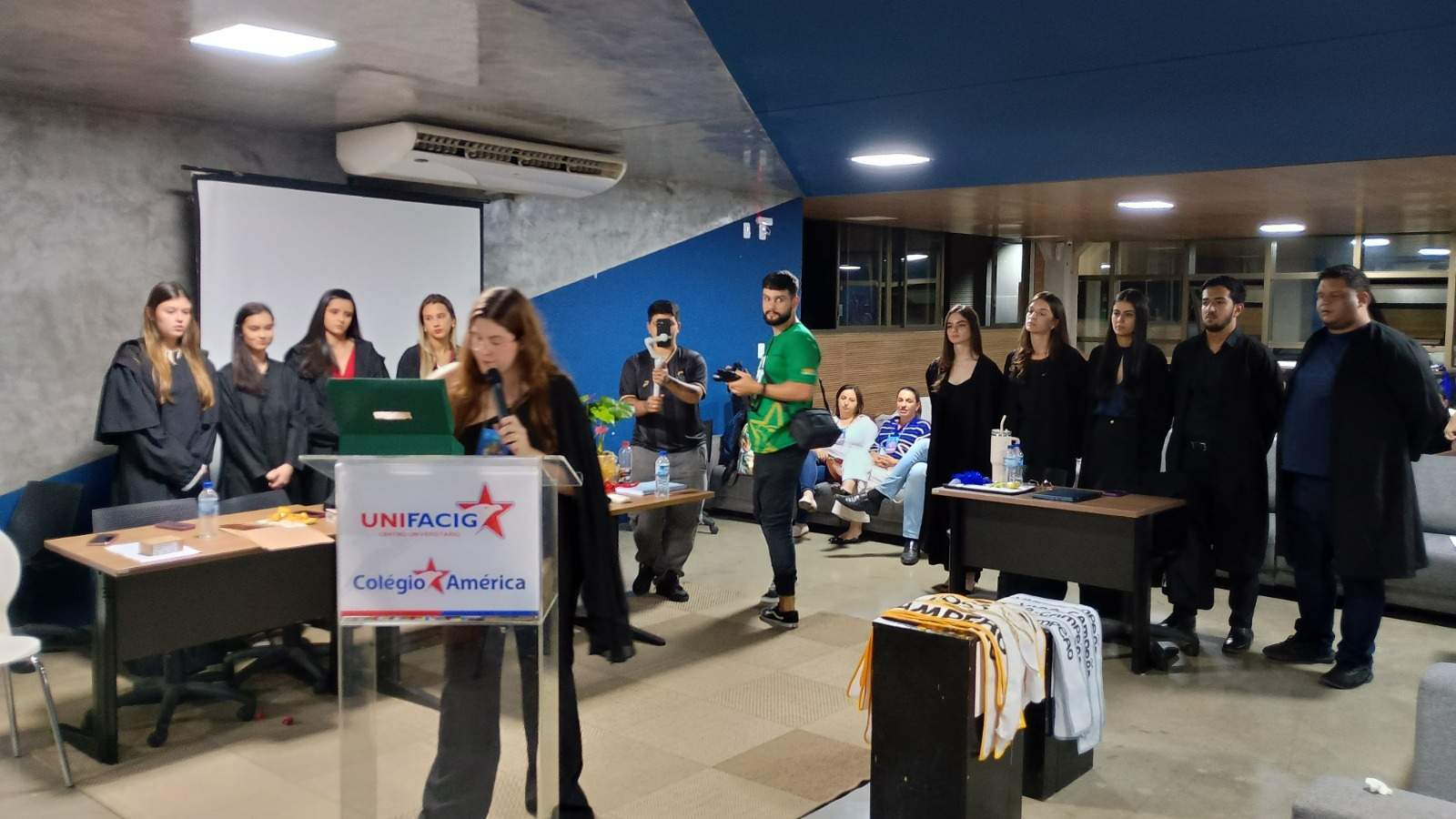 MANHUAÇU (MG) - Estudantes de Direito participaram da 1ª Copa Jurídica do Centro Universitário Unifacig. O competitivo evento reuniu autoridades e mobilizou os acadêmicos que, durante meses, preparam-se para a competição, elaborando defesa e acusação em um processo criminal.
