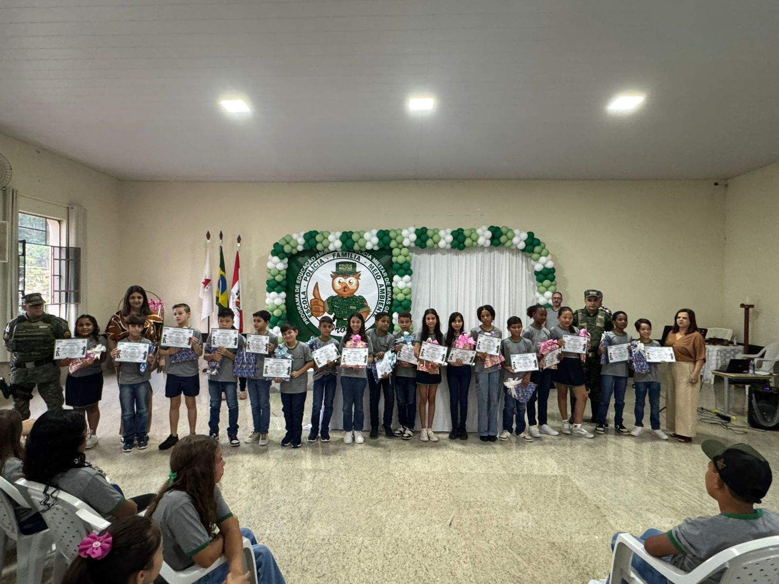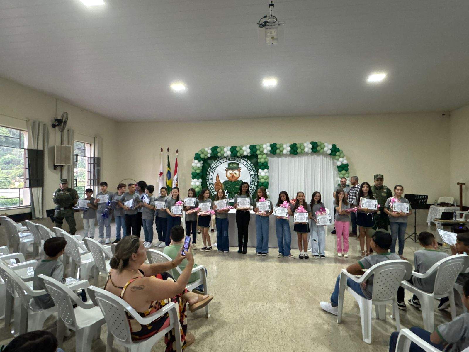 A solenidade contou com a presença do comandante do 2º Agrupamento de Polícia Militar do Meio Ambiente de Alto Caparaó, 1º Sargento Júlio Maria Alves Pereira, e do mediador e formador do PROGEA, 3º Sargento Emerson Amaral da Silva, cuja atuação tem fortalecido as ações pedagógicas voltadas ao meio ambiente no município.