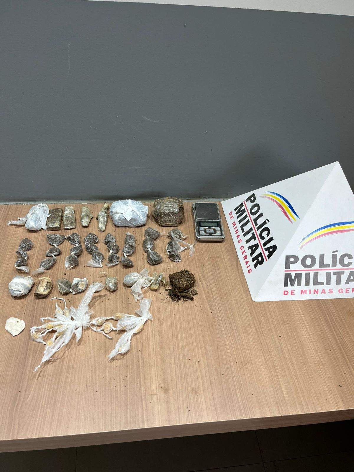 Durante a "Operação Presença que Protege", no bairro Nossa Senhora Aparecida, em Manhuaçu, um jovem de 19 anos foi preso após tentar fugir da abordagem policial e dispensar materiais ilícitos. Ele foi alcançado e, com o apoio do cão farejador Aquiles, foram encontrados um tablete e 22 buchas de maconha, 10 pedras de crack, uma balança de precisão, dois celulares, uma pochete e dinheiro.