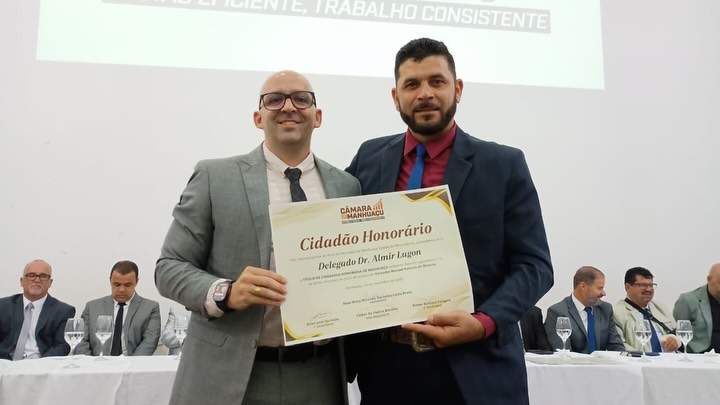 MANHUAÇU (MG) - O delegado regional de Manhuaçu Almir Lugon foi homenageado nesta sexta-feira (28/11) com o Título de Cidadão Honorário de Manhuaçu, concedido pela Câmara Municipal. A indicação partiu do vereador Misrael Patrício de Oliveira e foi aprovada por todos os vereadores, que reconheceram o trabalho desenvolvido pelo delegado desde que assumiu a chefia da 6ª Delegacia Regional de Polícia Civil.