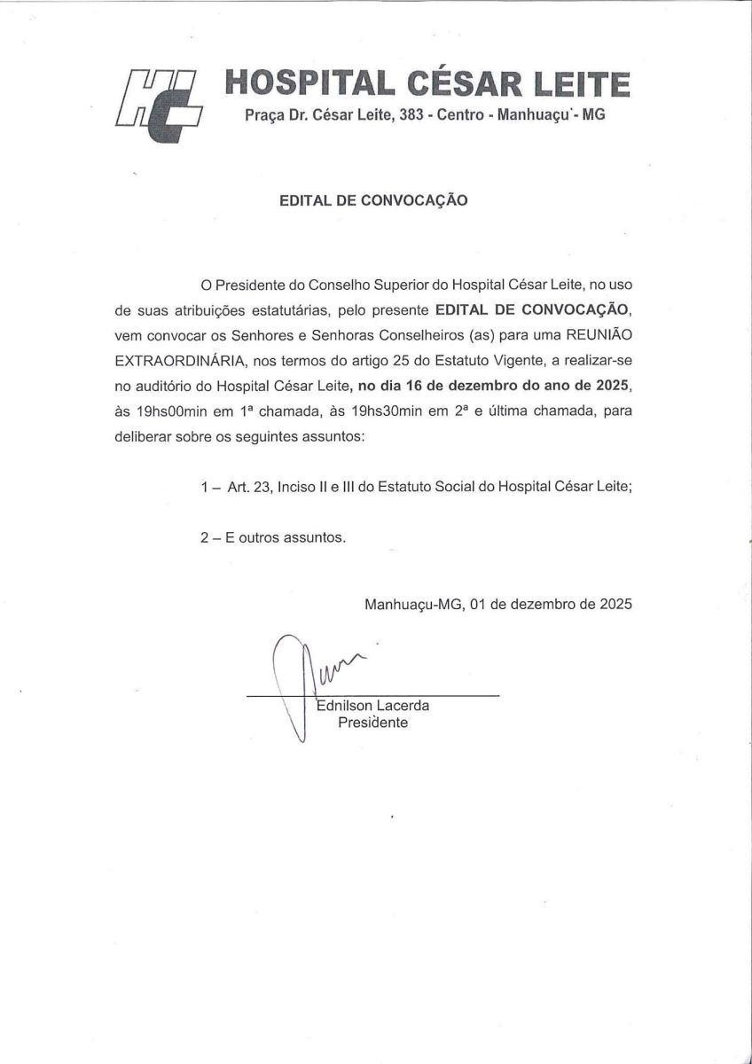 Edital de Convocação de Assembleia Geral Extraordinária - Hospital César Leite