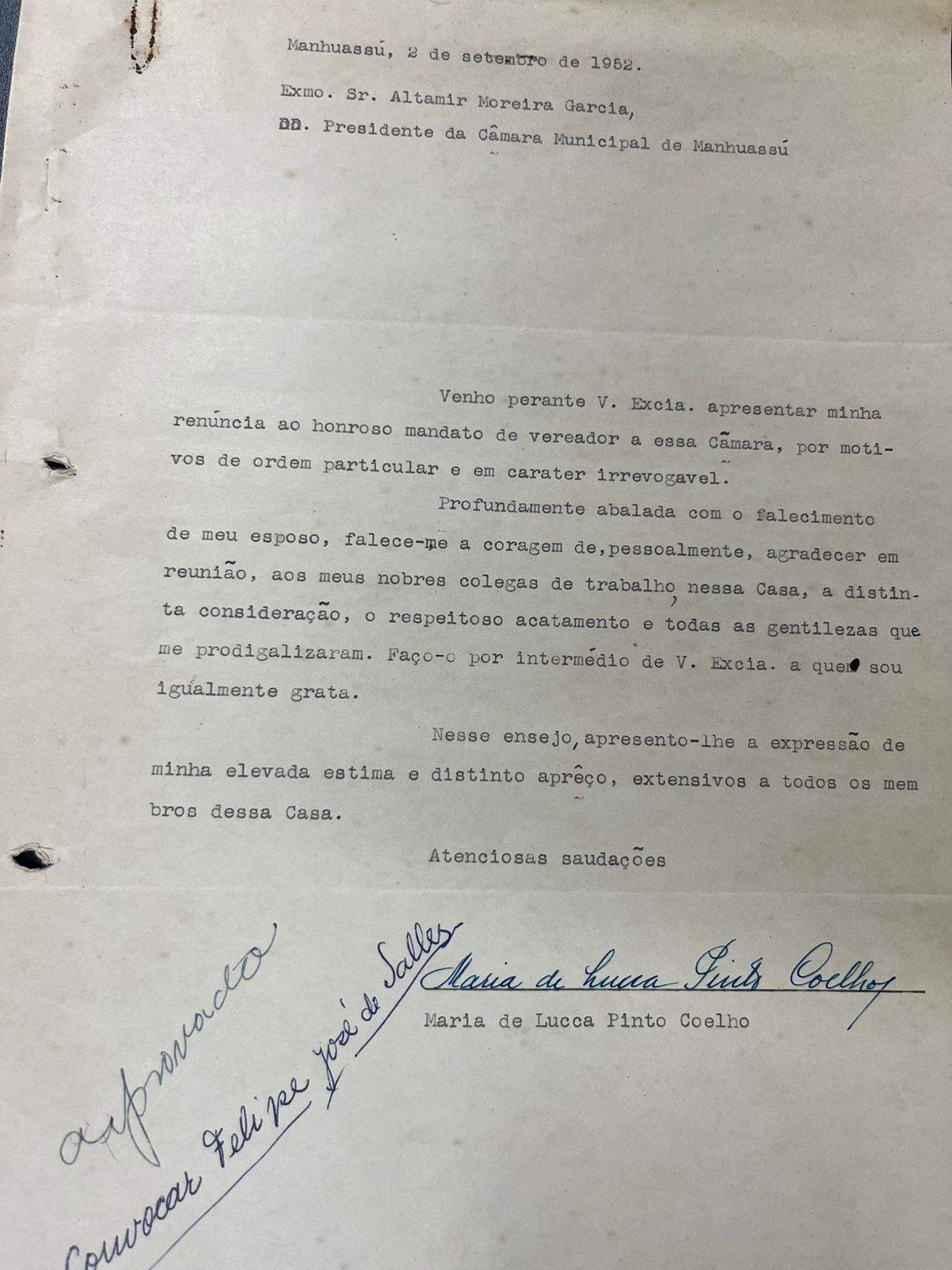 MANHUAÇU (MG) - A Câmara Municipal de Manhuaçu resgatou um marco da história política local com a divulgação da carta de renúncia da vereadora Maria de Lucca Pinto Coelho, datada de 2 de setembro de 1952. O documento foi reencontrado por meio do projeto “Revivendo a História”, da Escola do Legislativo, que visa preservar a memória institucional do município.